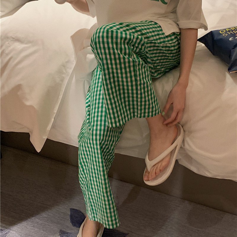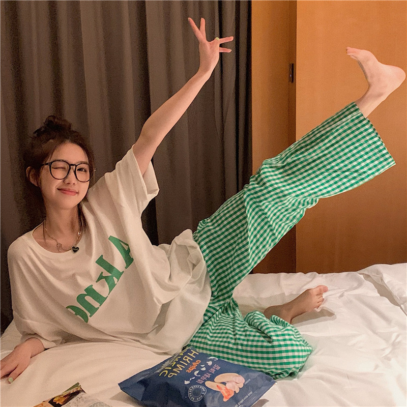 녹색 격자 무늬 바지를 입고 여성 여름 세트 잠옷 느슨한 반팔 최고 캐주얼 홈 의류 투피스 세트스토어 가기
