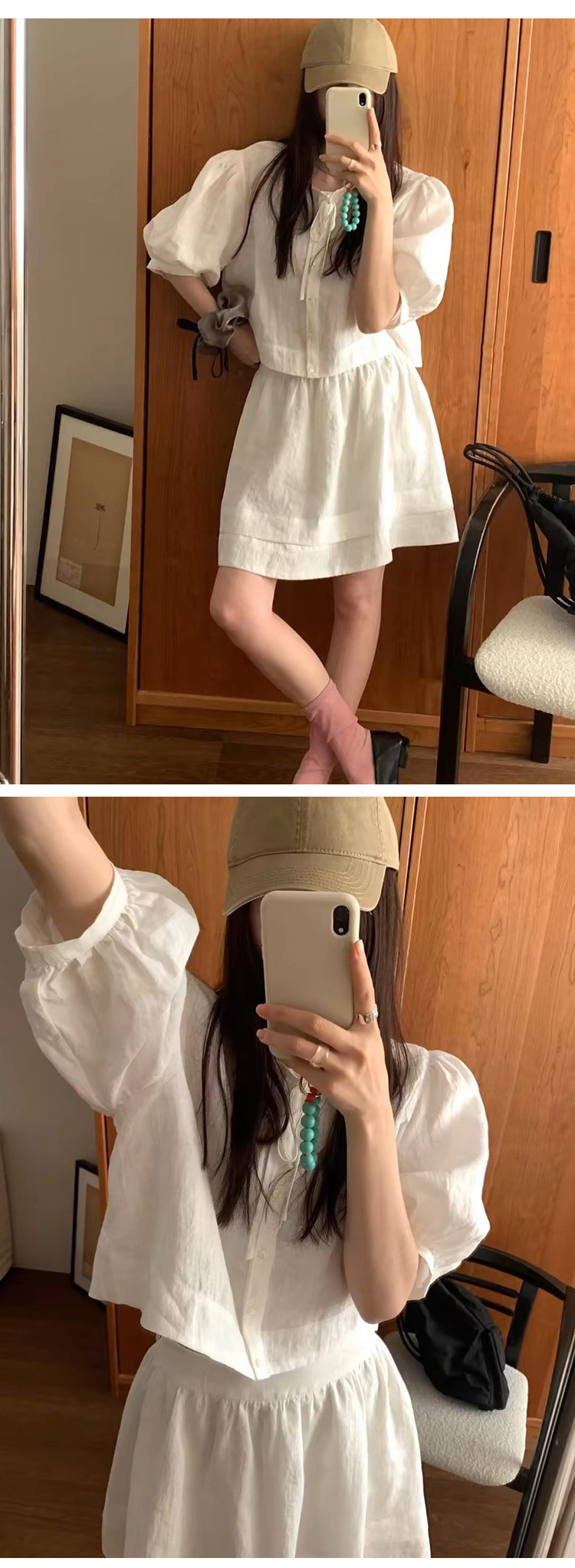 한국 동대문 장난기 나이 줄인 퍼프 소매 한국 가리 리넨 탑 반탄성 허리 스커트 세트