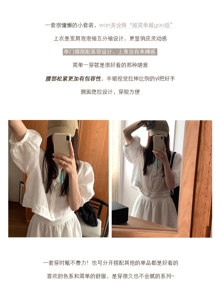 한국 동대문 장난기 나이 줄인 퍼프 소매 한국 가리 리넨 탑 반탄성 허리 스커트 세트스토어 가기