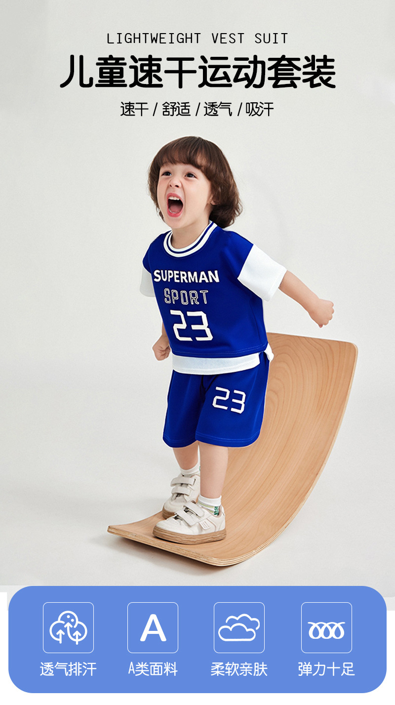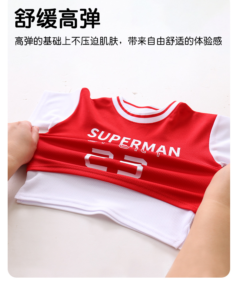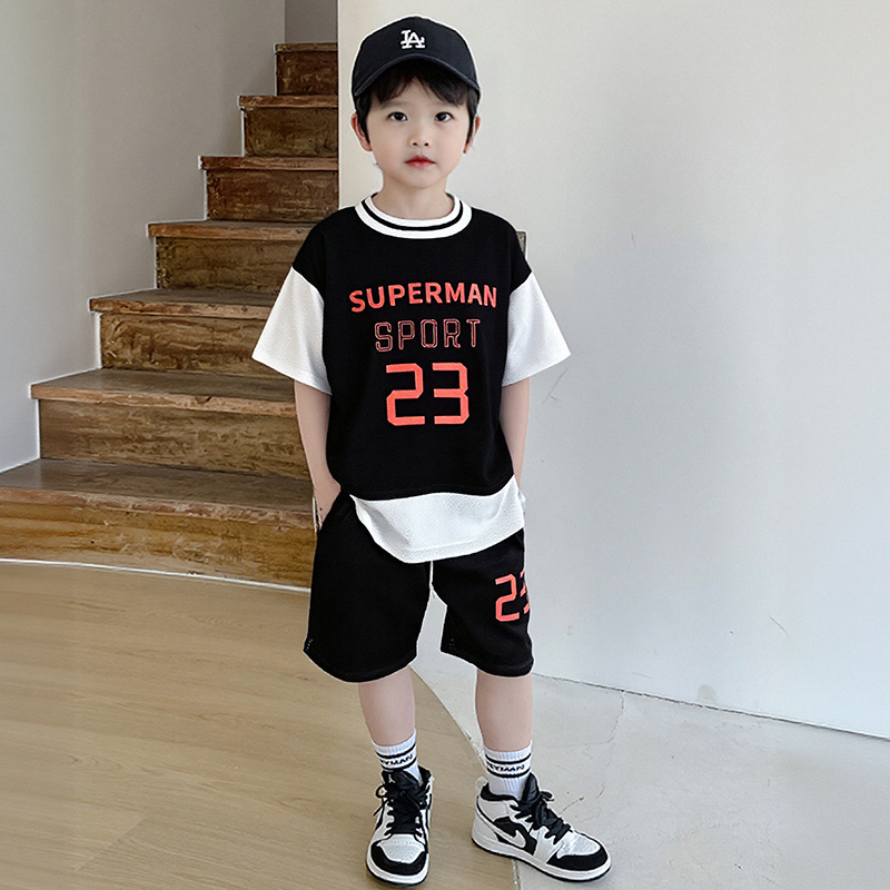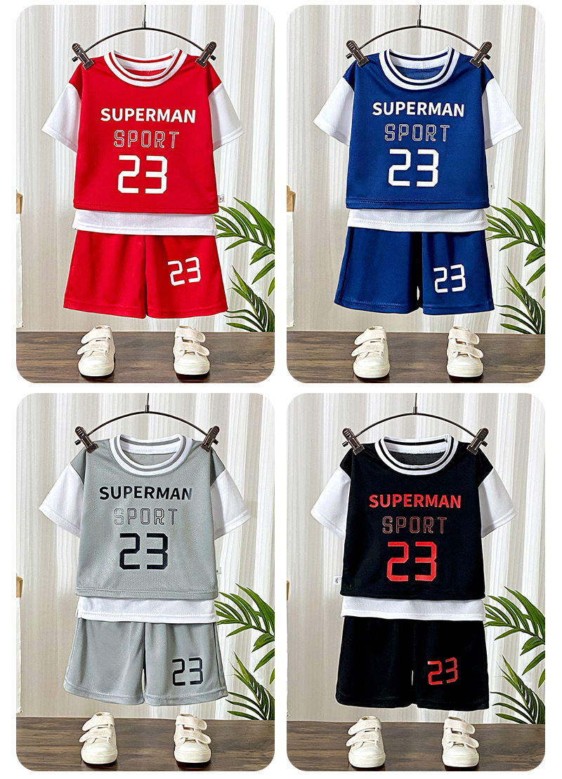 새로운 여름 어린이 스포츠 반팔 농구 세트 세트 가짜 투피스 소년 저지 소녀 훈련 의류 도매