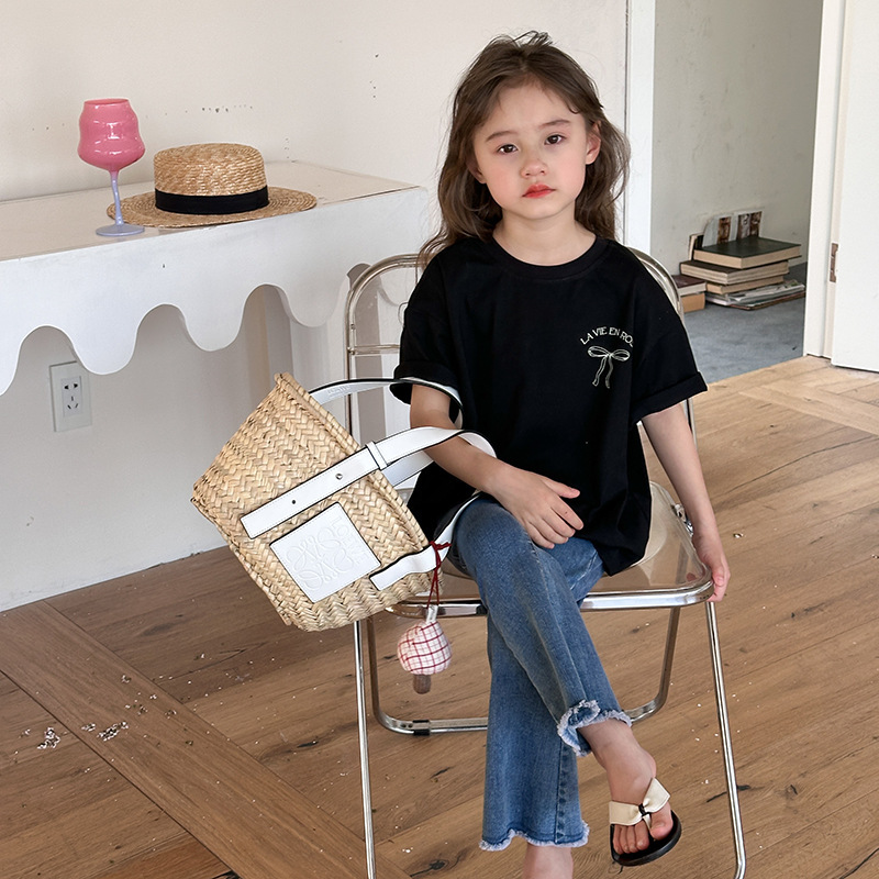 여아 티셔츠 드레스 아동복 여름 스타일 어린이 반팔 중대형 한국 스타일 루즈핏 뒷면 리본 티셔츠 롱 캐주얼스토어 가기
