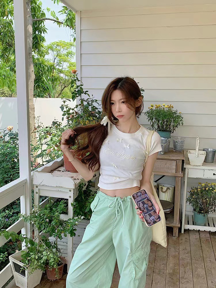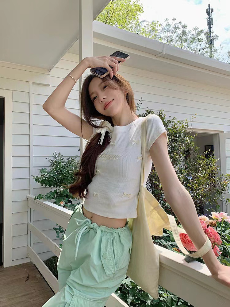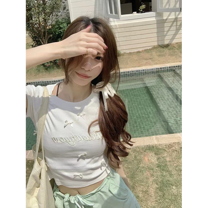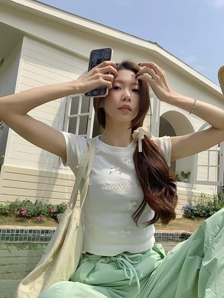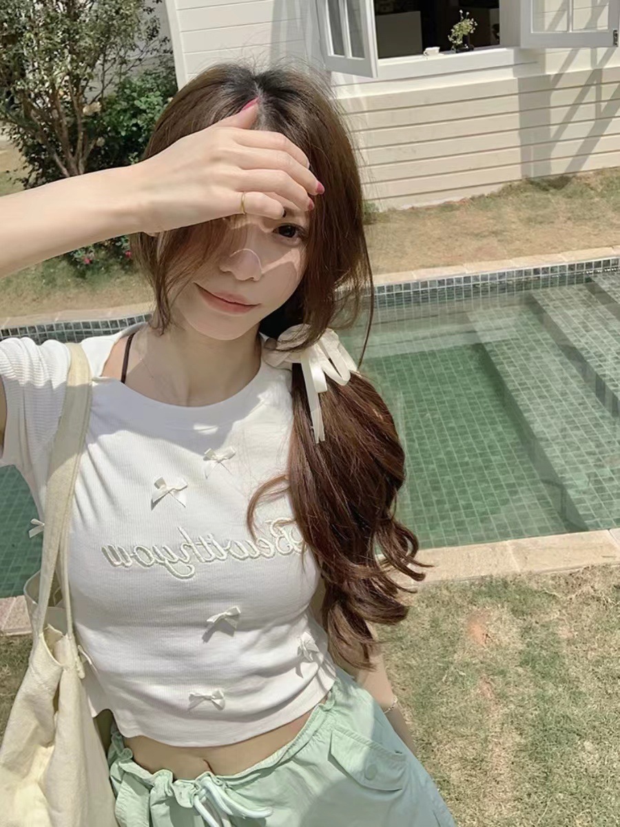 여름 활 자수 나이를 줄이는 달콤한 반팔 어깨 티셔츠 작은 순수한 욕망 스파이스 걸스를위한 여성용 쇼트 탑