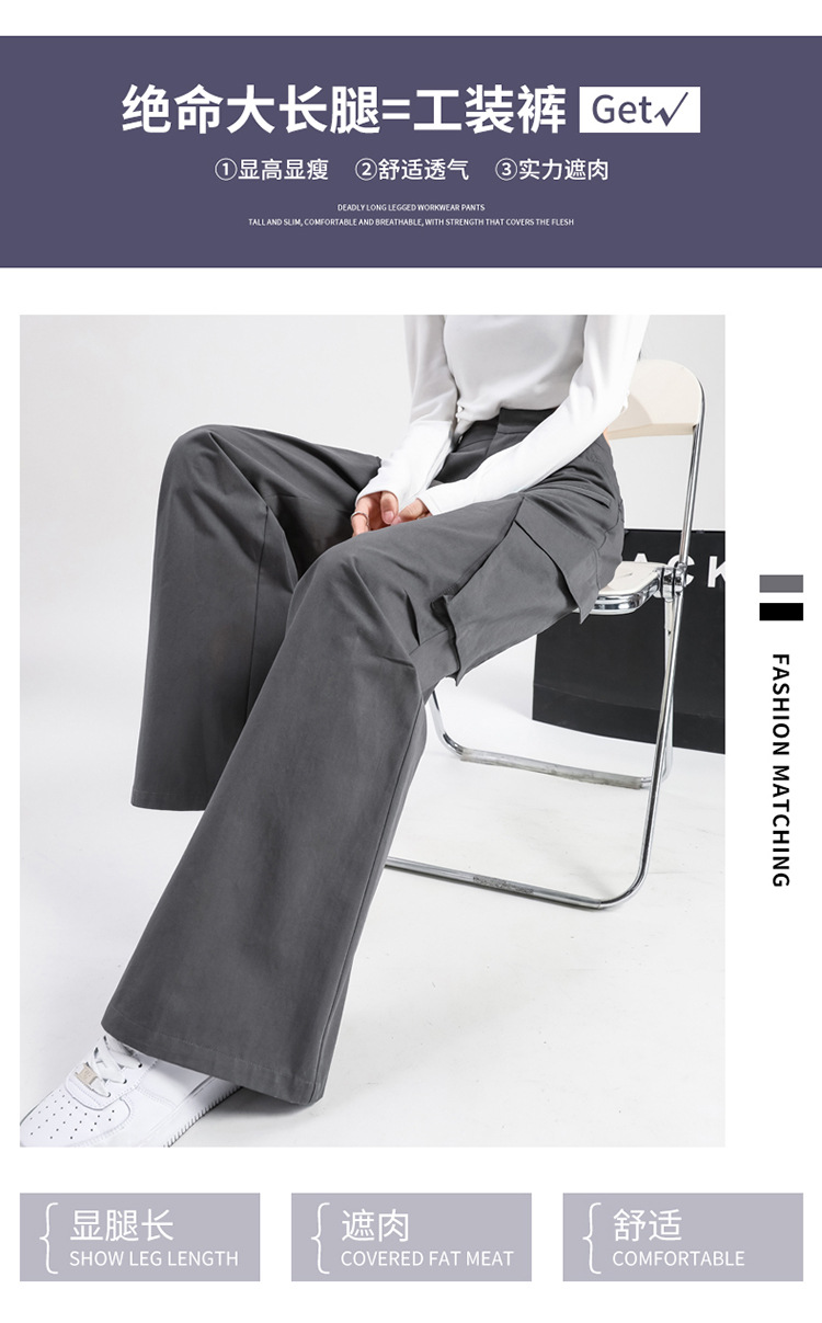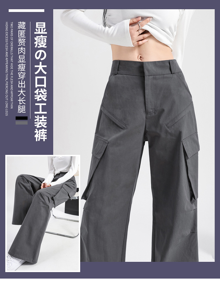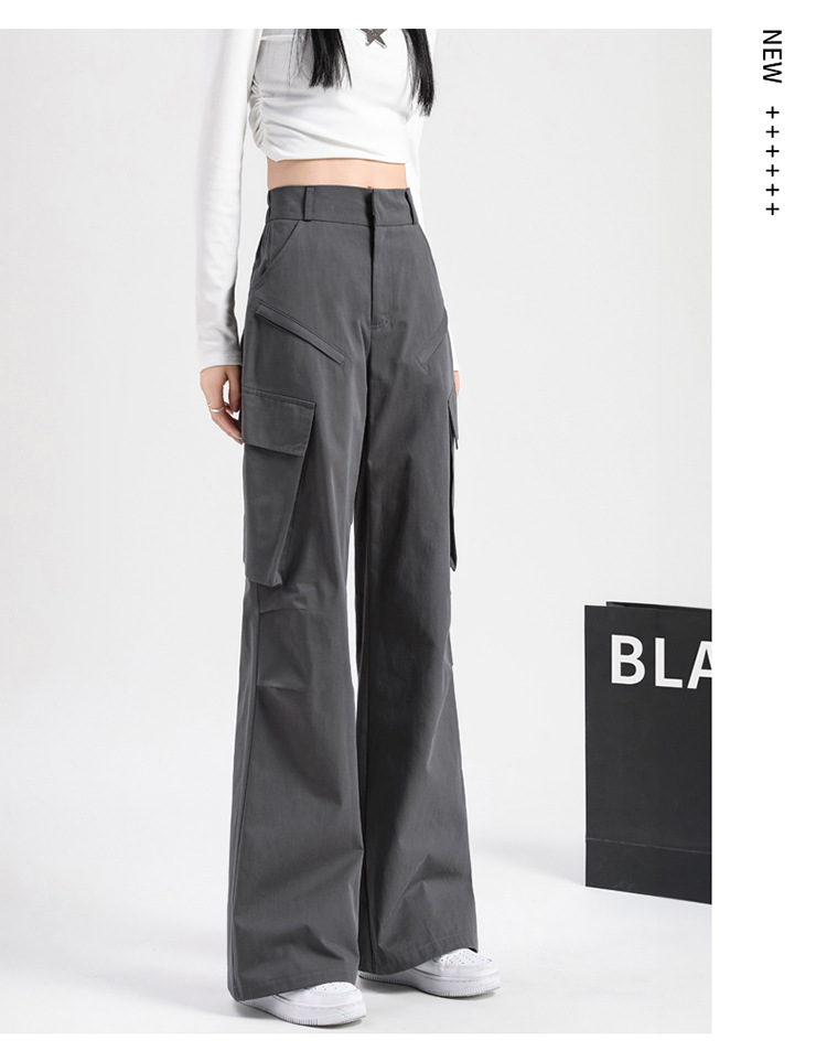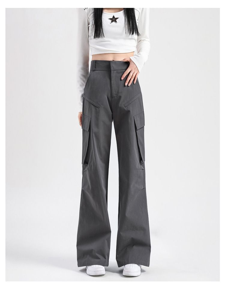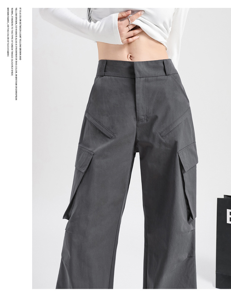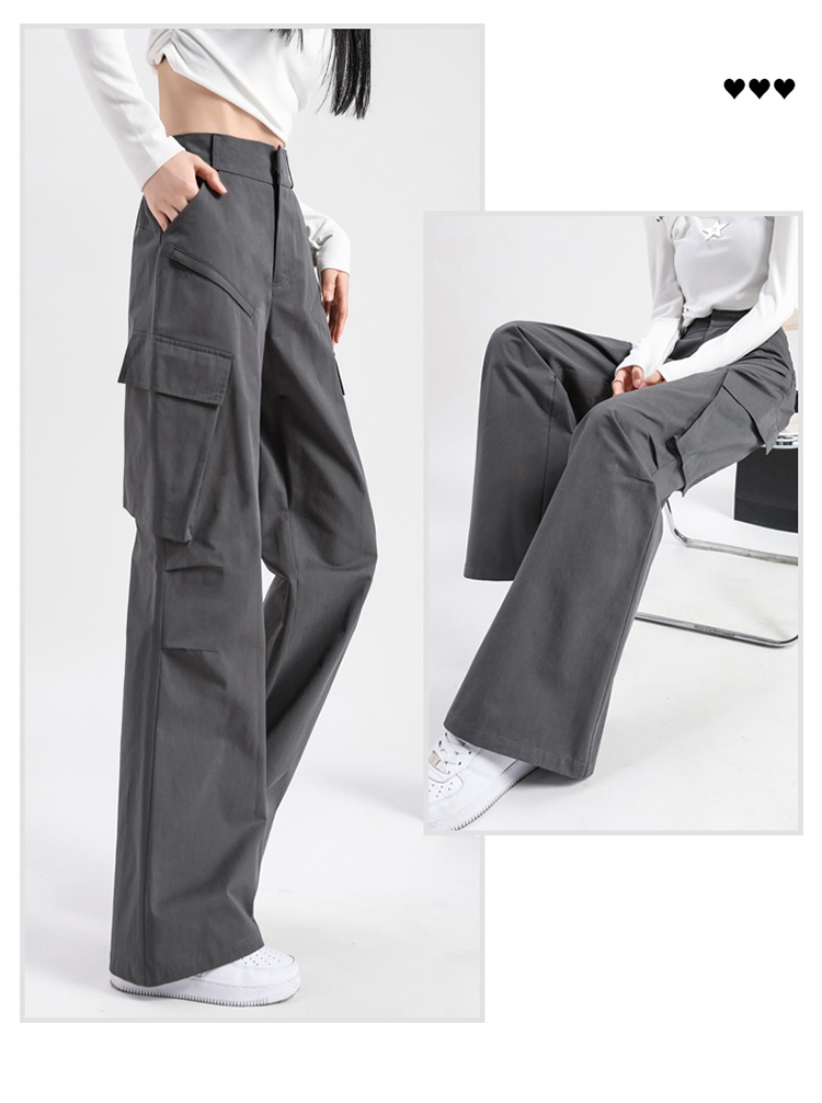 주의 바지 여자의 봄과 가을 2024 새로운 도착 회색 미국 스타일 레트로 큰 포켓 높은 허리 스포츠 캐주얼 와이드 다리 바지스토어 가기
