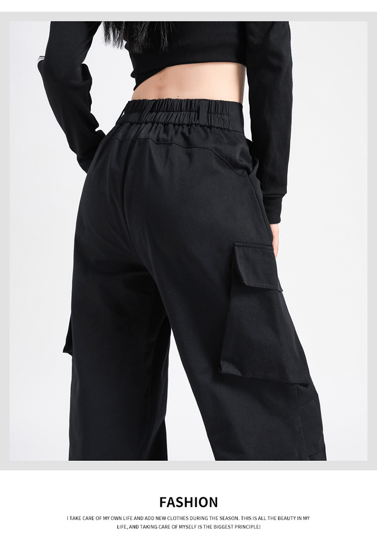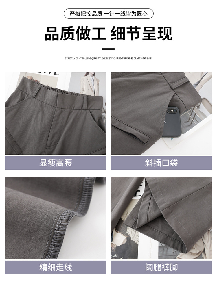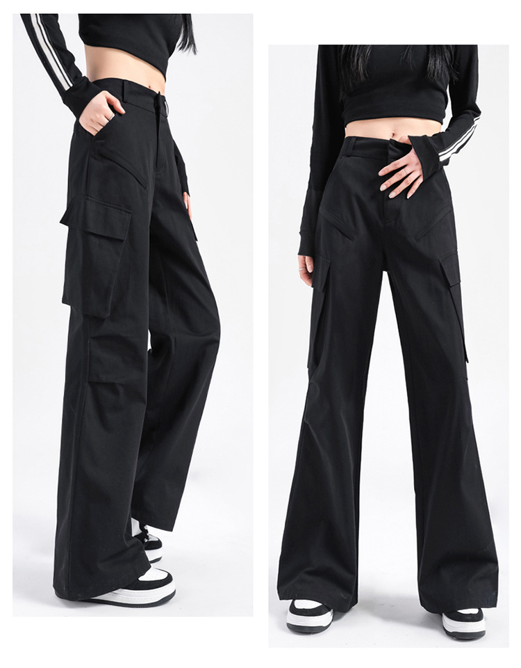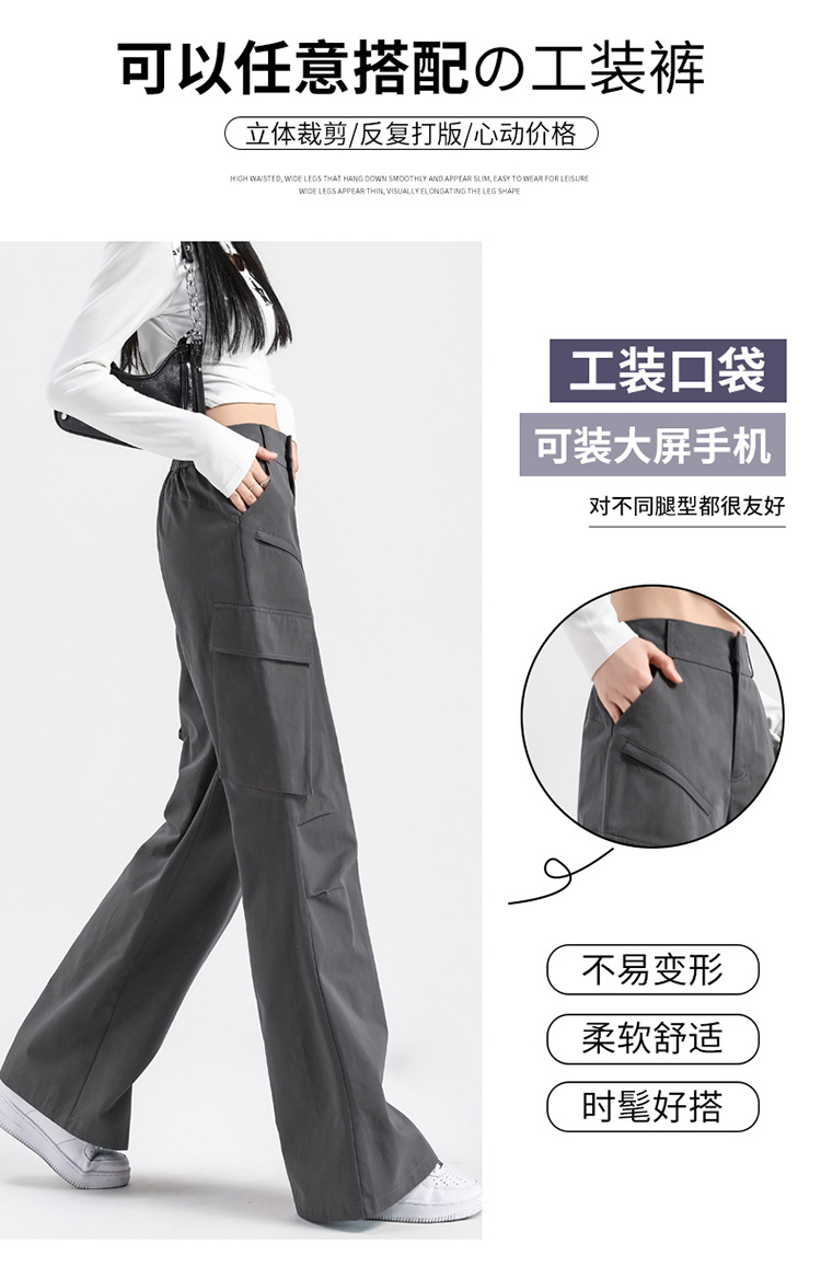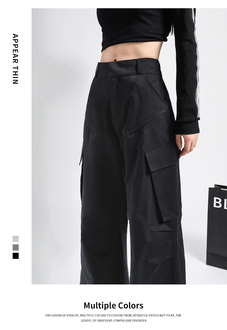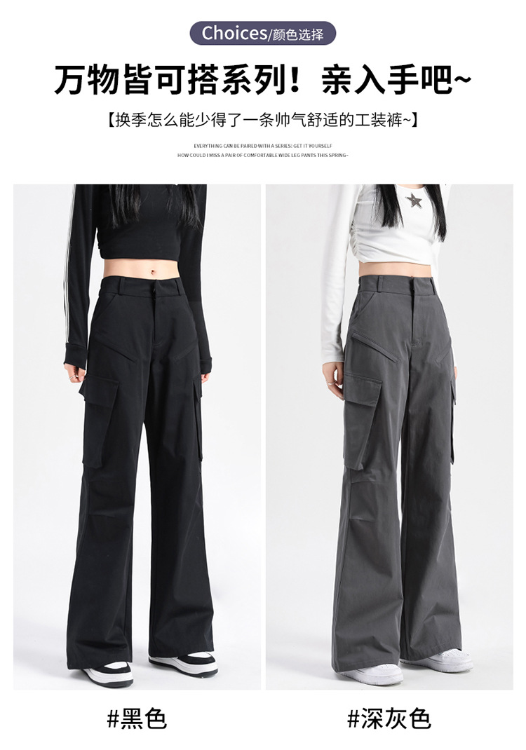 주의 바지 여자의 봄과 가을 2024 새로운 도착 회색 미국 스타일 레트로 큰 포켓 높은 허리 스포츠 캐주얼 와이드 다리 바지스토어 가기