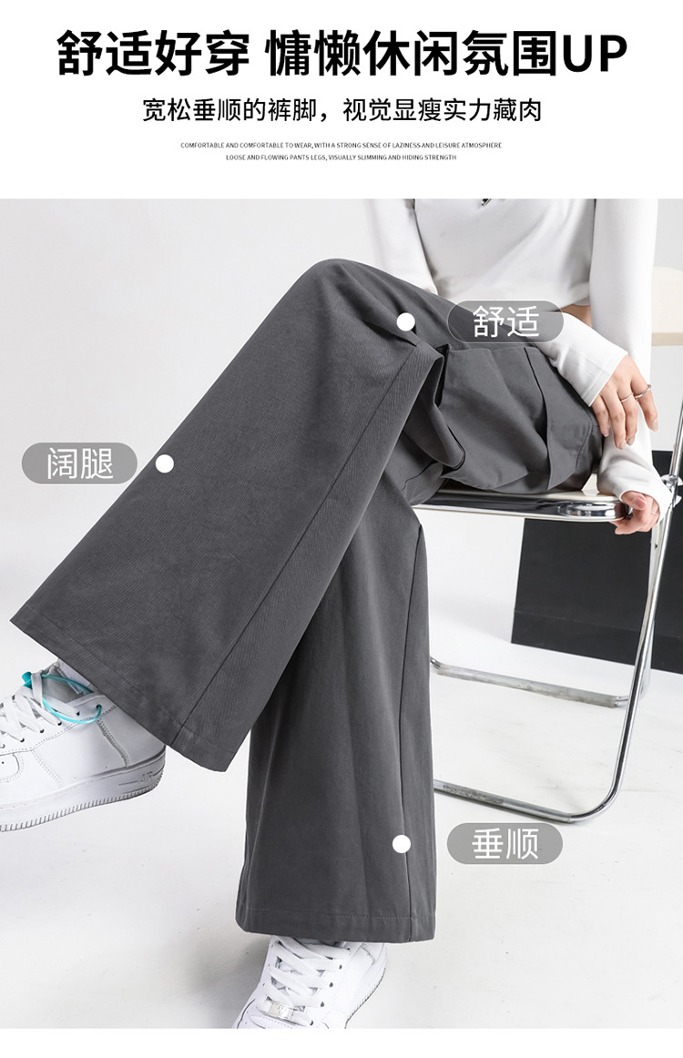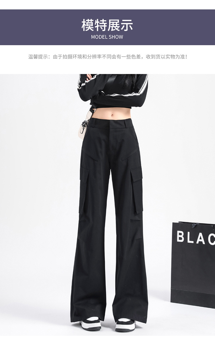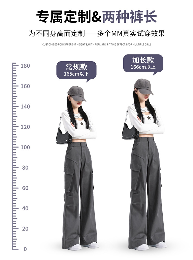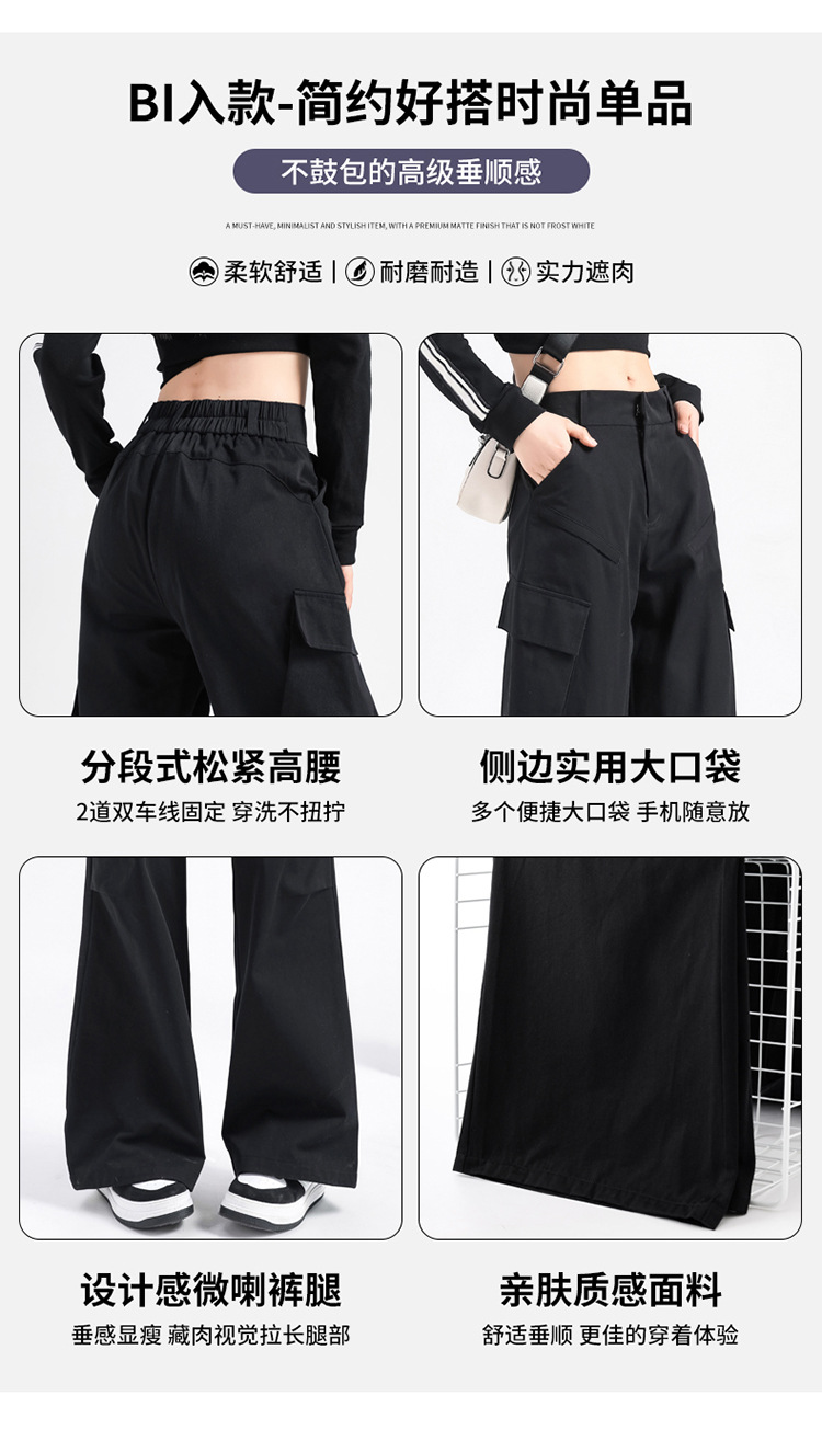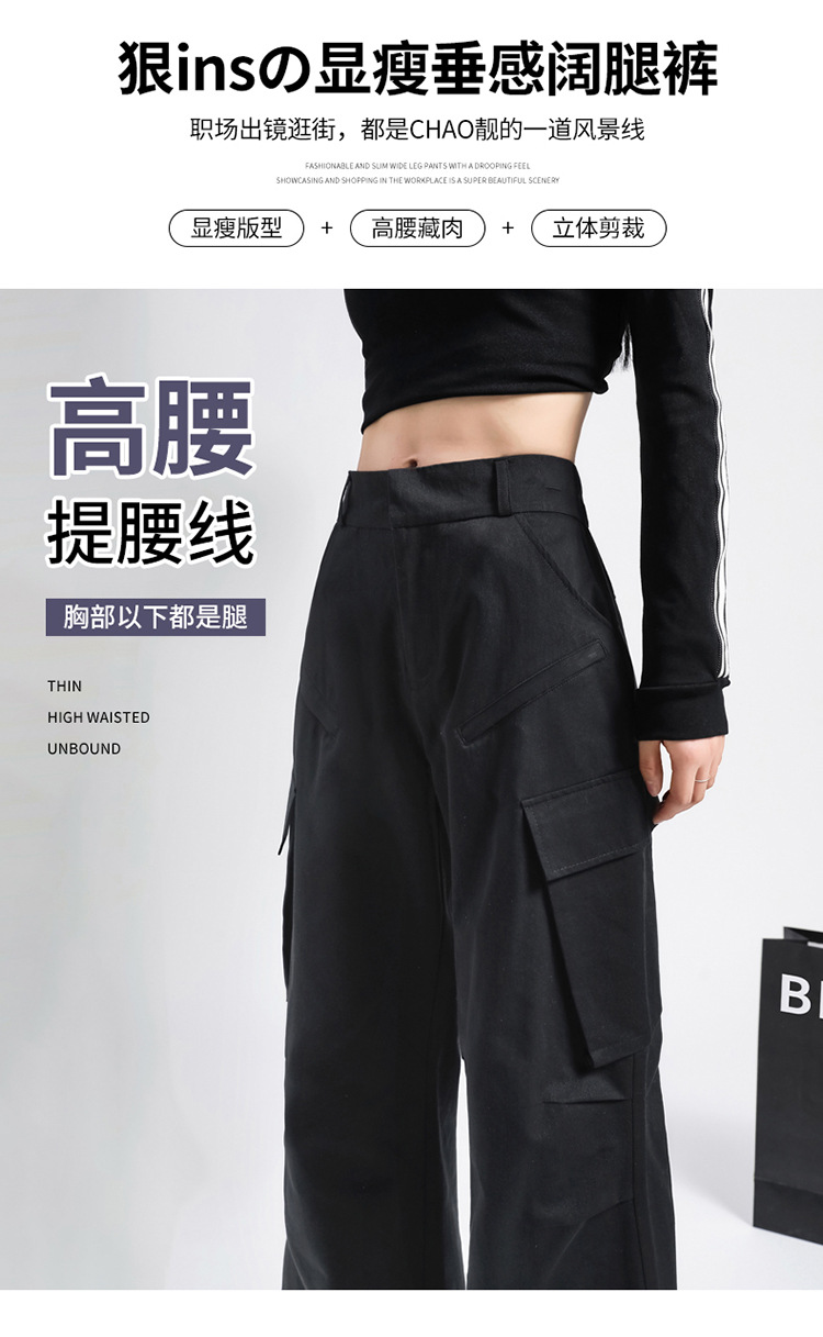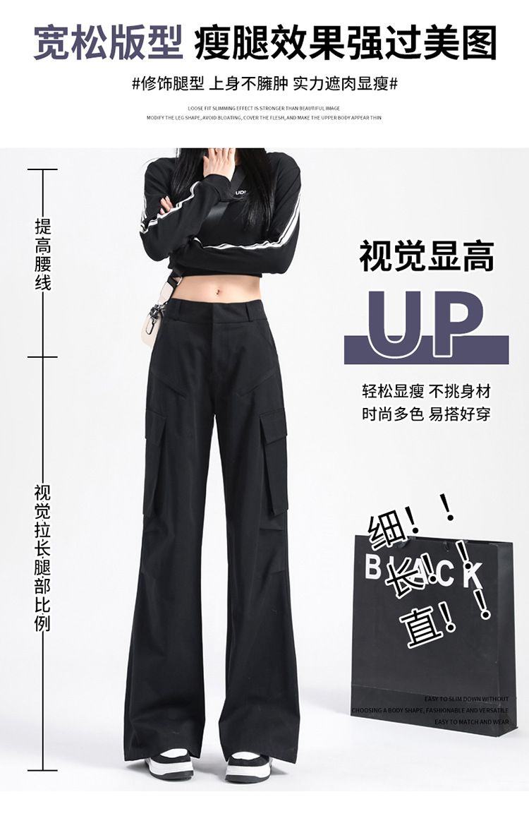 주의 바지 여자의 봄과 가을 2024 새로운 도착 회색 미국 스타일 레트로 큰 포켓 높은 허리 스포츠 캐주얼 와이드 다리 바지스토어 가기