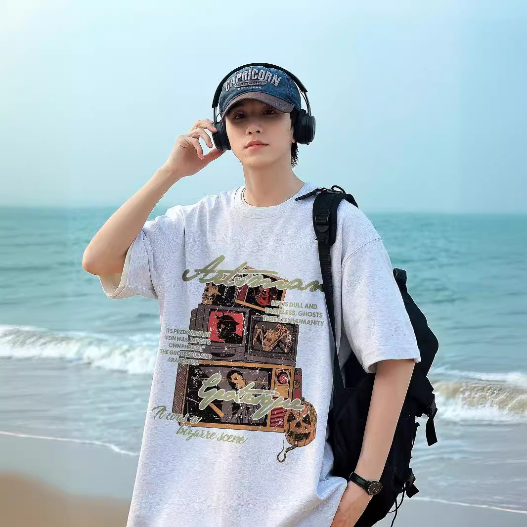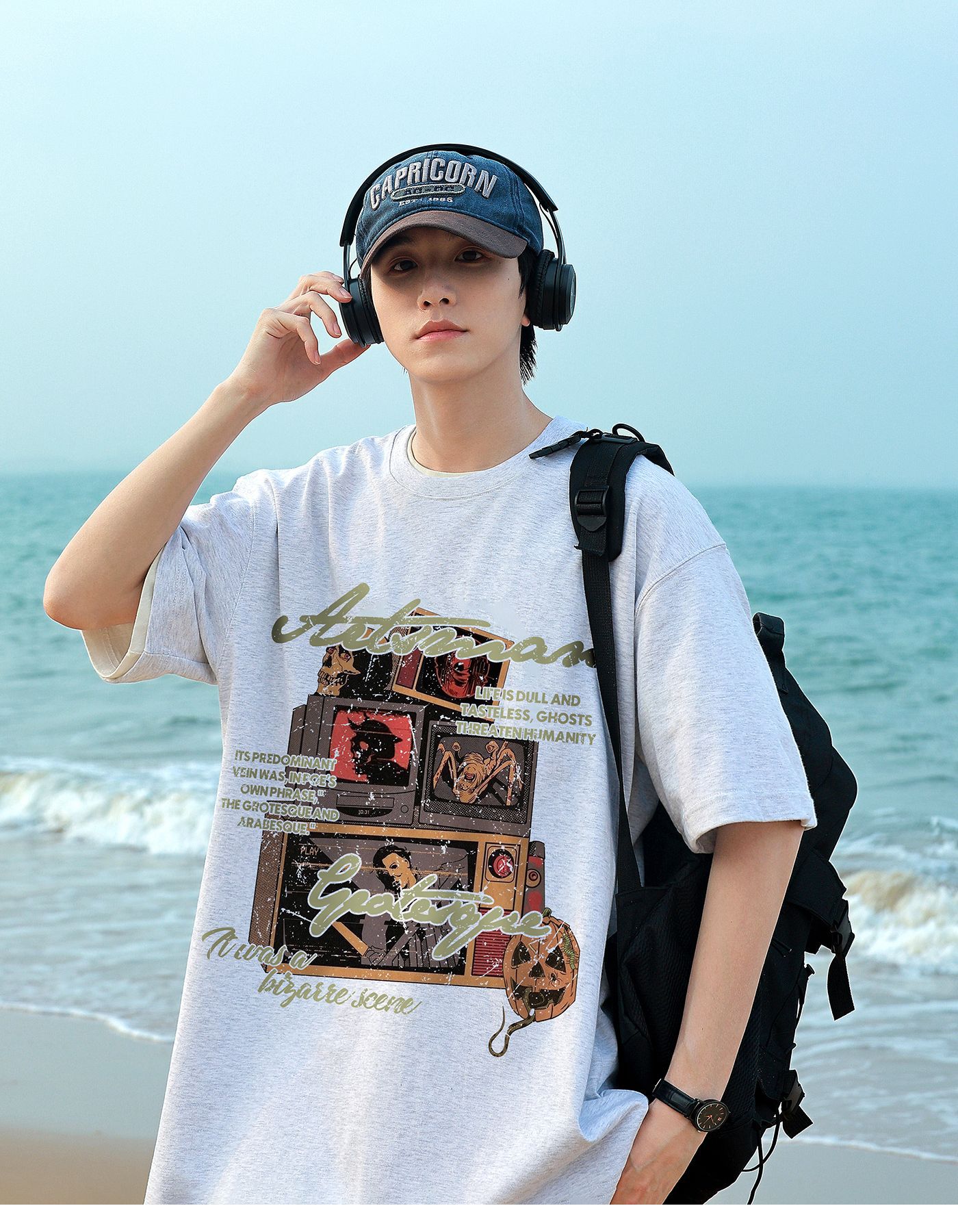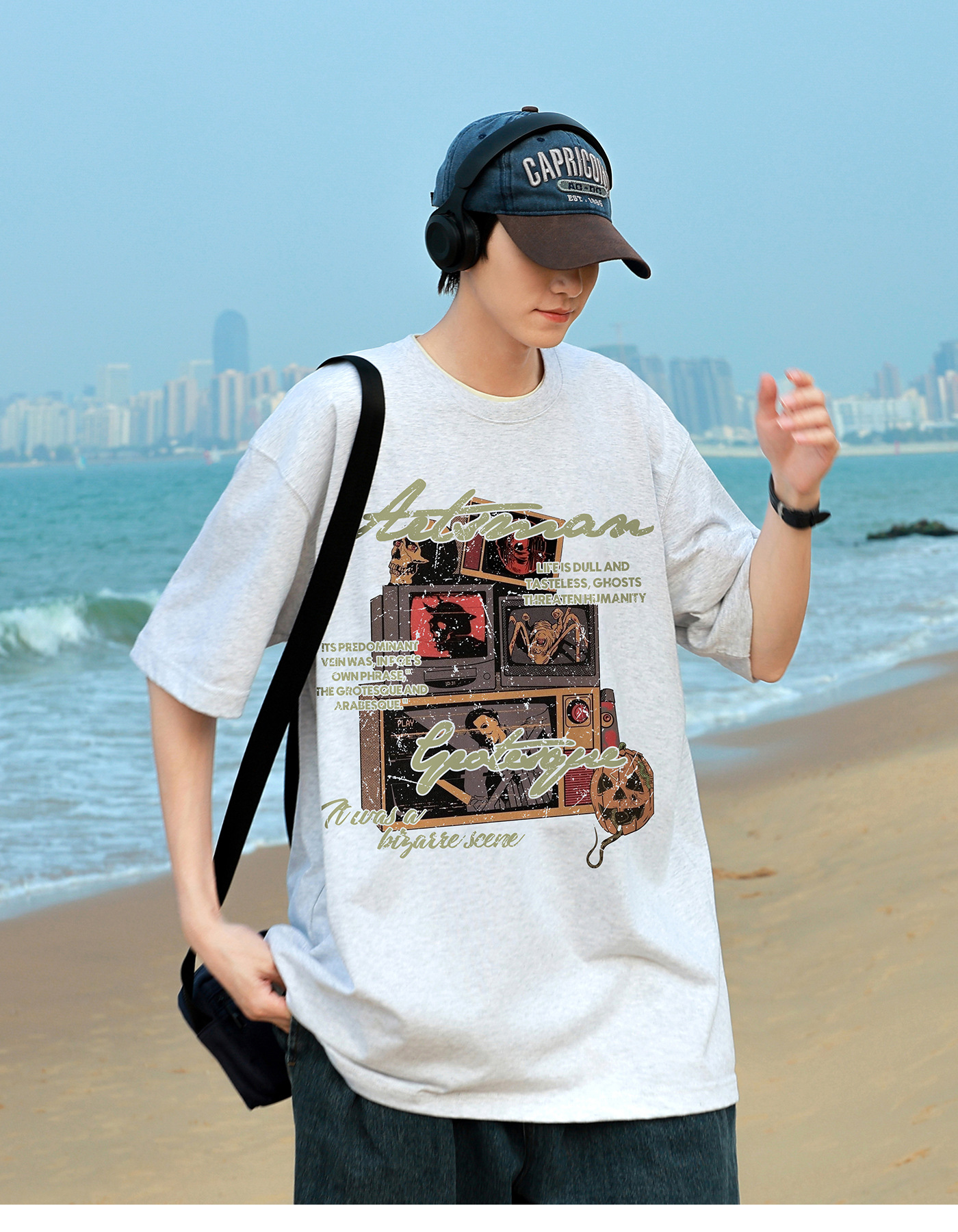 공장 직접 공급 270g 무거운 오래된 인쇄 짧은 소매 남성 여름 새로운 미국 거리 소년 작은 목선 티셔츠스토어 가기