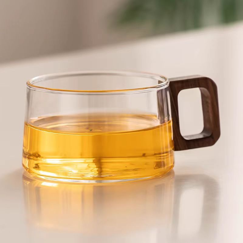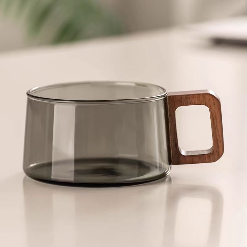 유리 컵 고온 저항하는 검은 색 투명 높은 붕규산 유리 차 물 분리 부두 컵 뚜껑이있는 나무 유리 단층 컵스토어 가기
