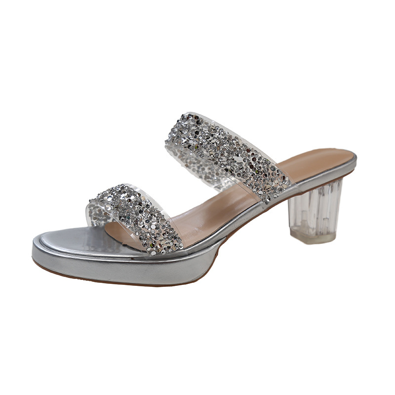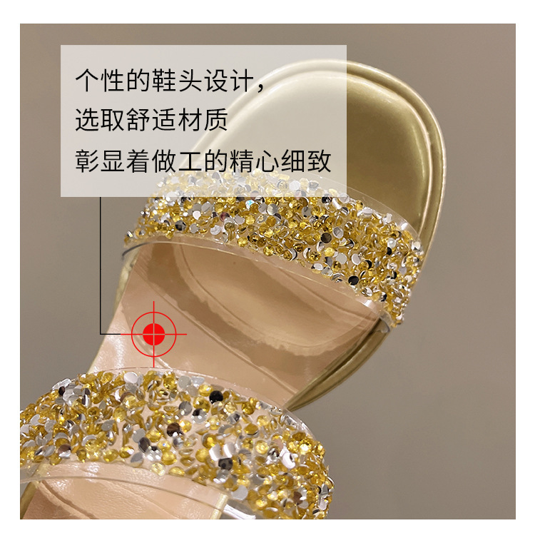 2024 년 여름 새로운 하이힐 슈즈 크리스털 두꺼운 힐링 여성용 외형 여성용 샌들 여성용 라인스톤 투명 슬라이드 샌들