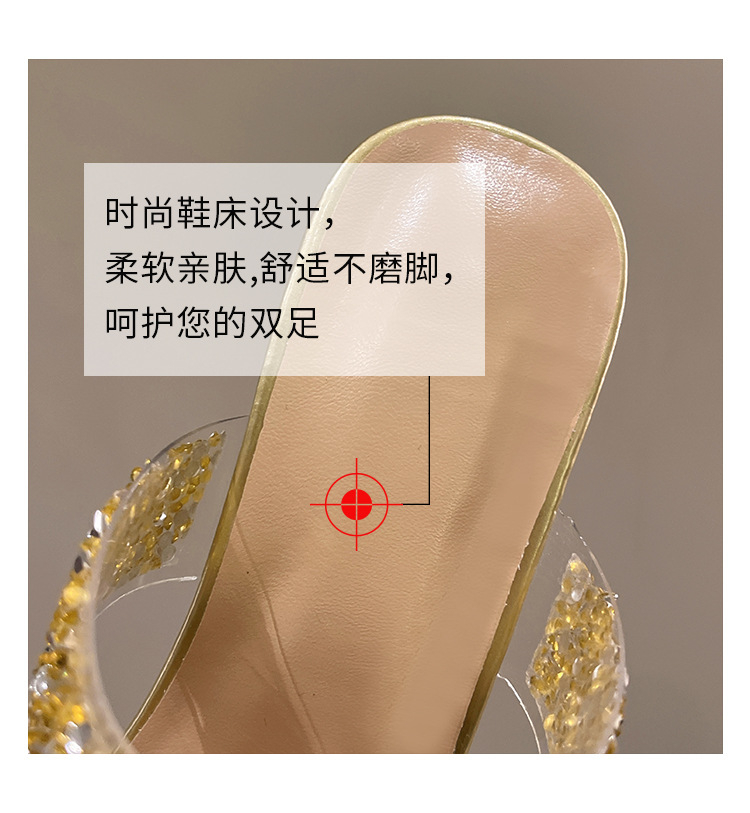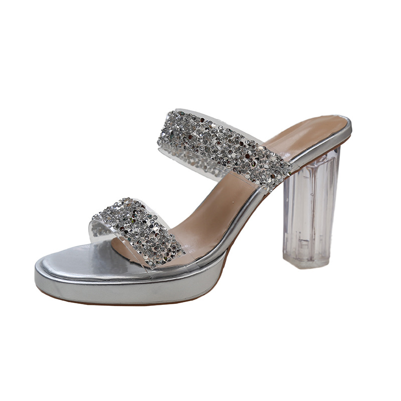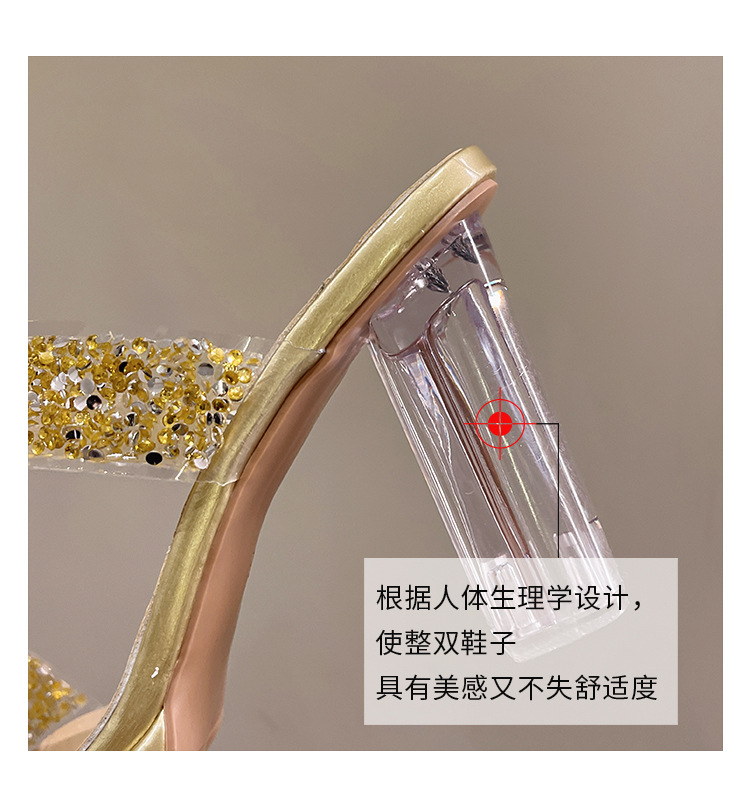 2024 년 여름 새로운 하이힐 슈즈 크리스털 두꺼운 힐링 여성용 외형 여성용 샌들 여성용 라인스톤 투명 슬라이드 샌들스토어 가기