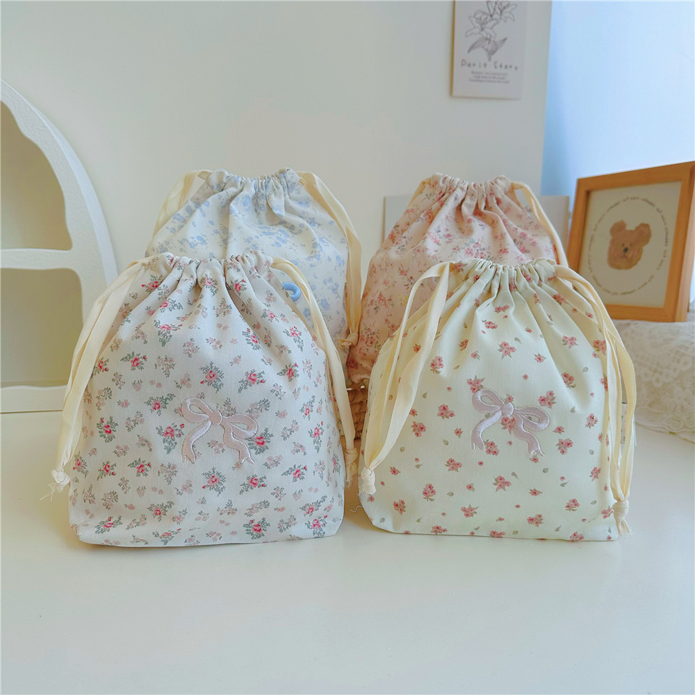 小碎花棉布刺绣蝴蝶结抽绳束口袋