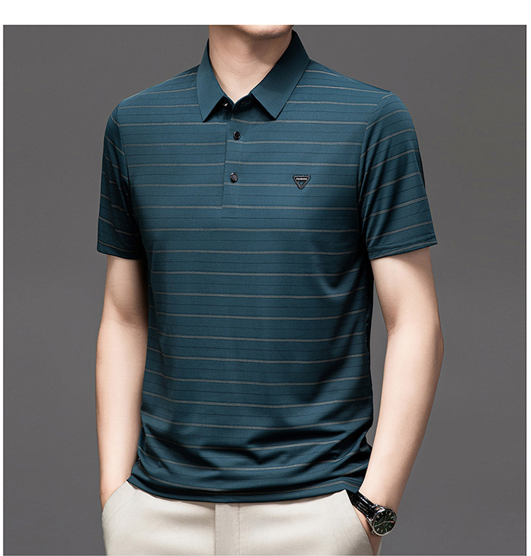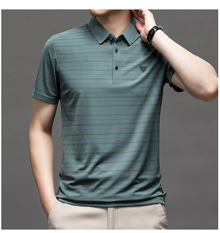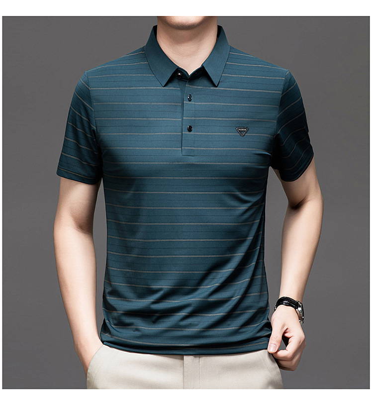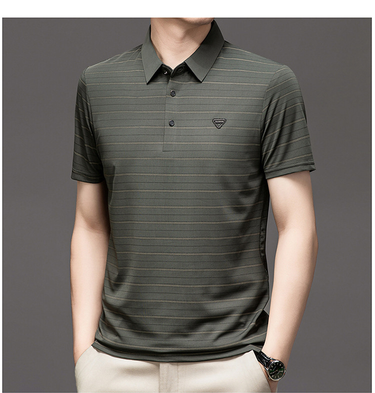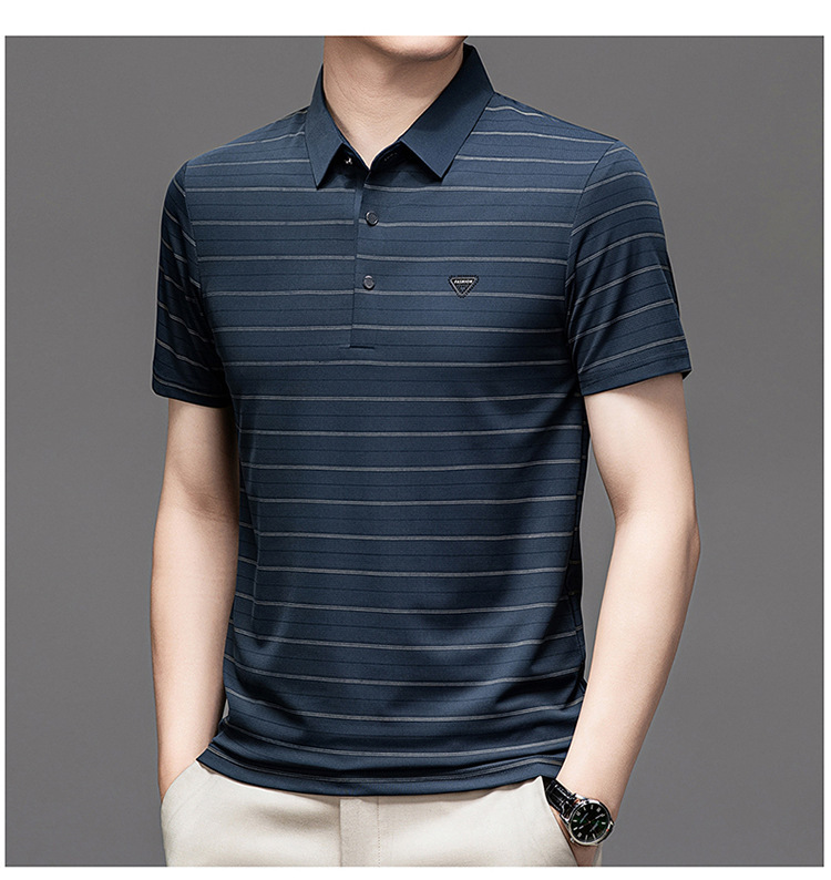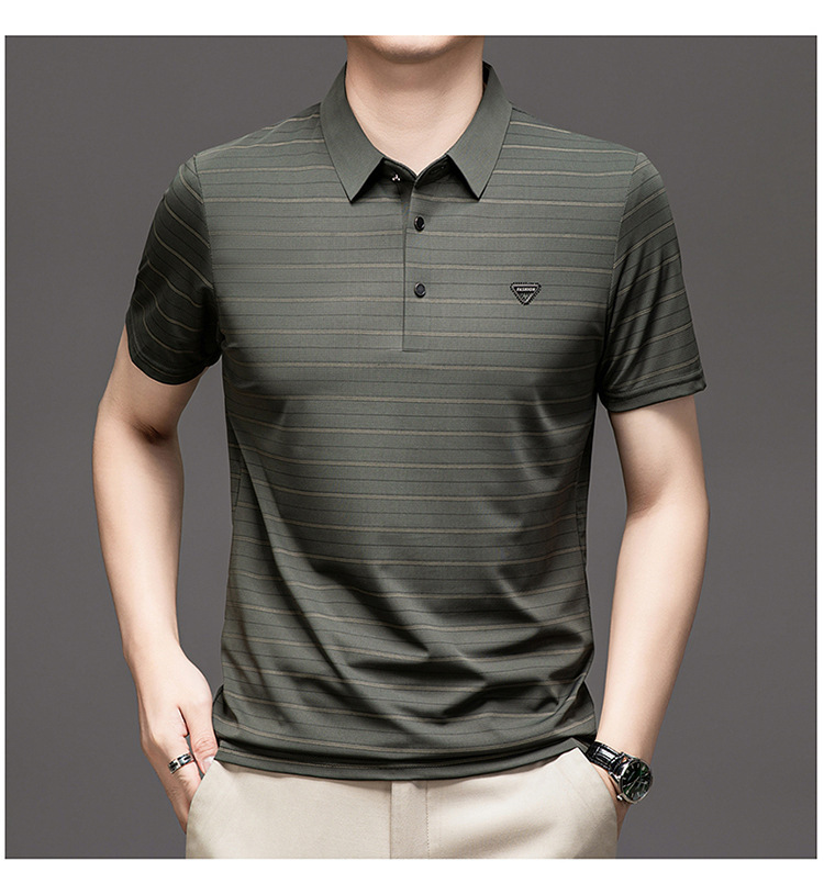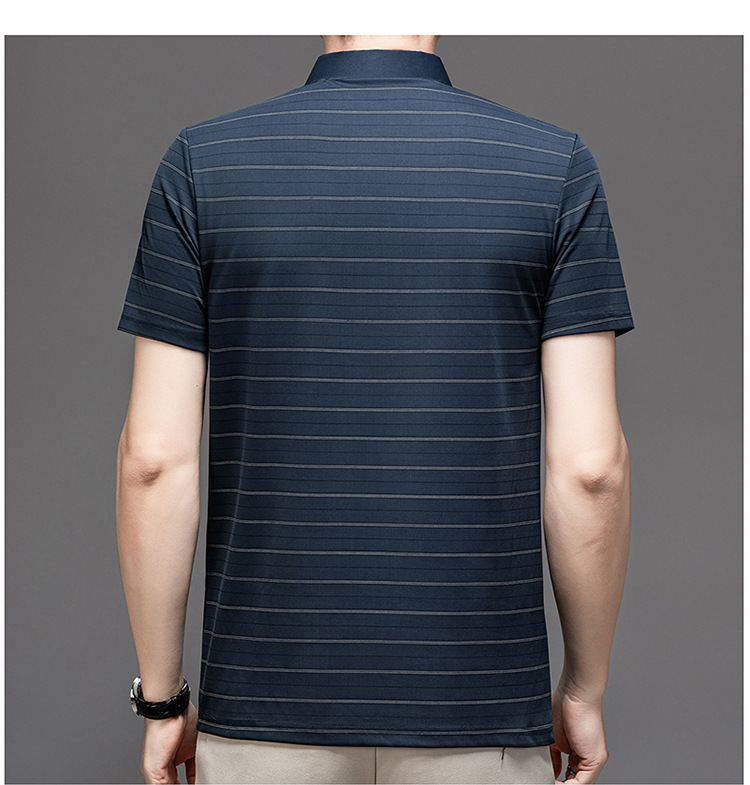아이스 실크 얇은 줄무늬 반팔 폴로 셔츠 남자 2024 여름 느슨한 캐주얼 랩 티셔츠 중년 및 노인 아빠스토어 가기