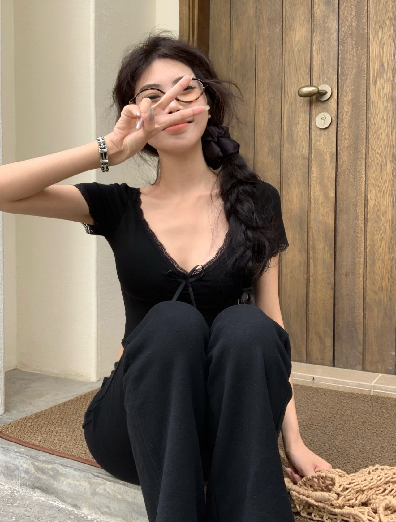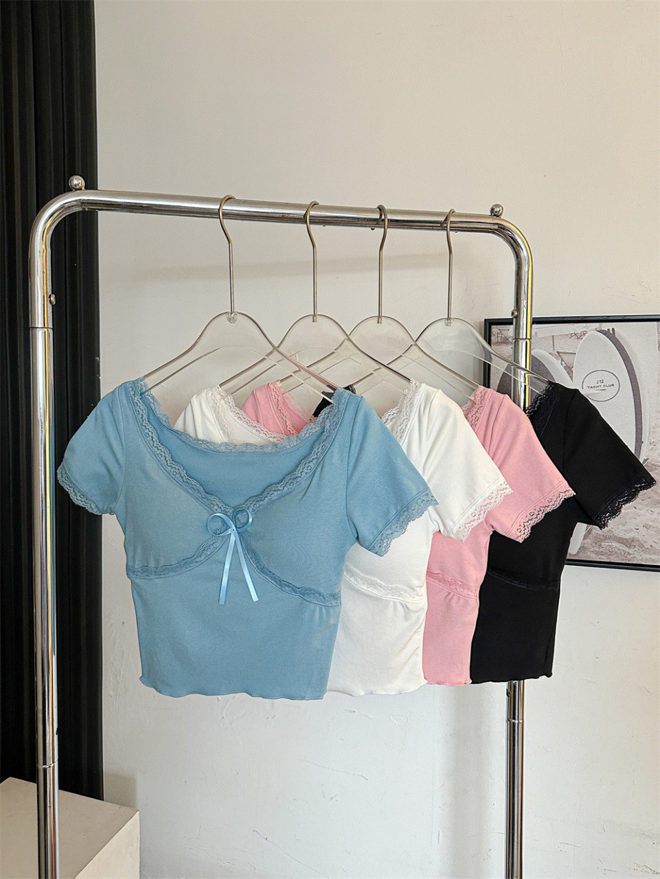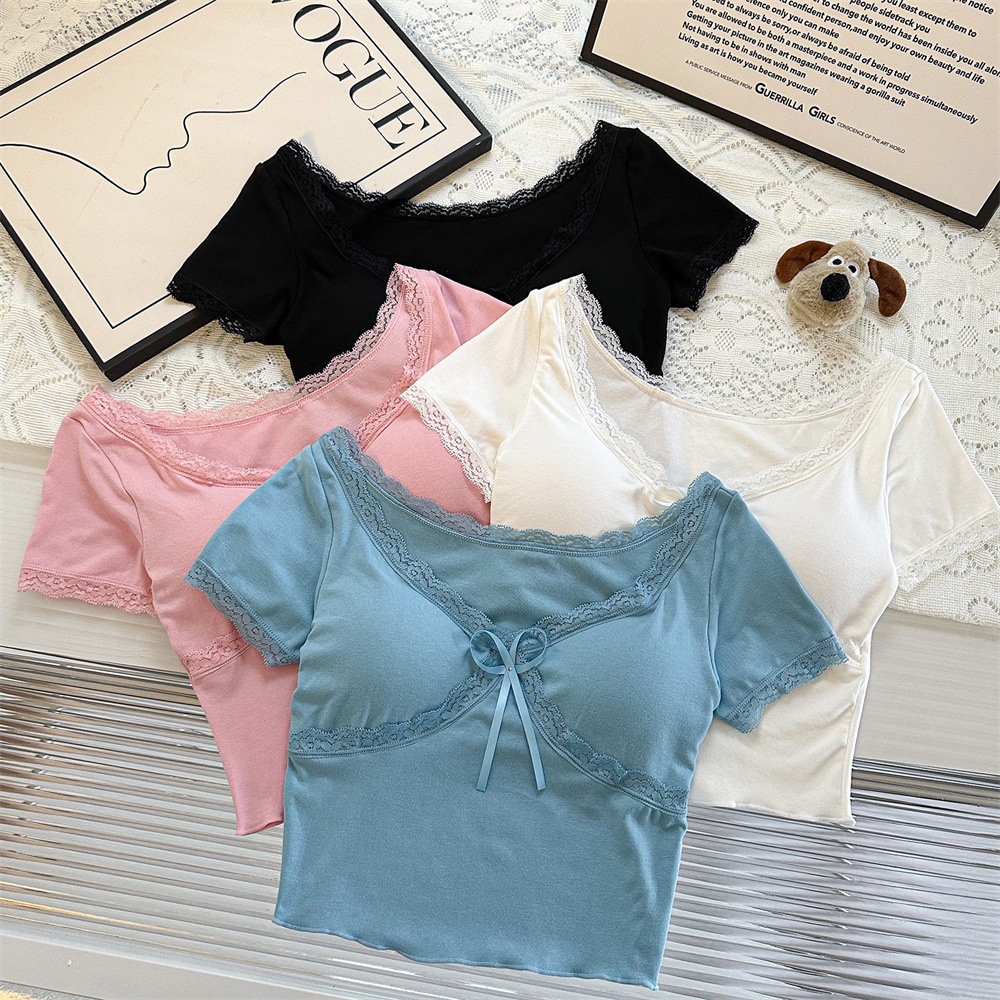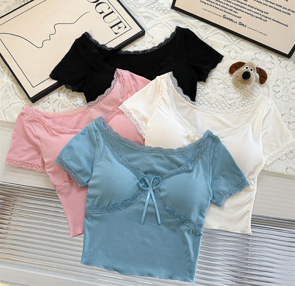 5010 # 새로운 레이스 V-넥 바느질 짧은 티셔츠 여성용 여름 슬림 핏 슬리밍 섹시한 스파이스 소녀 활 탑스토어 가기