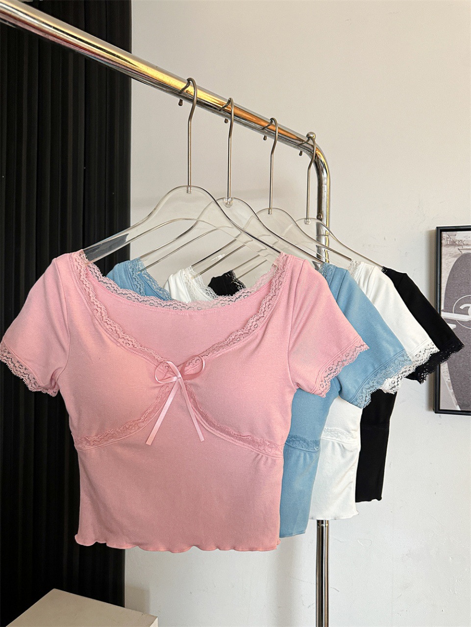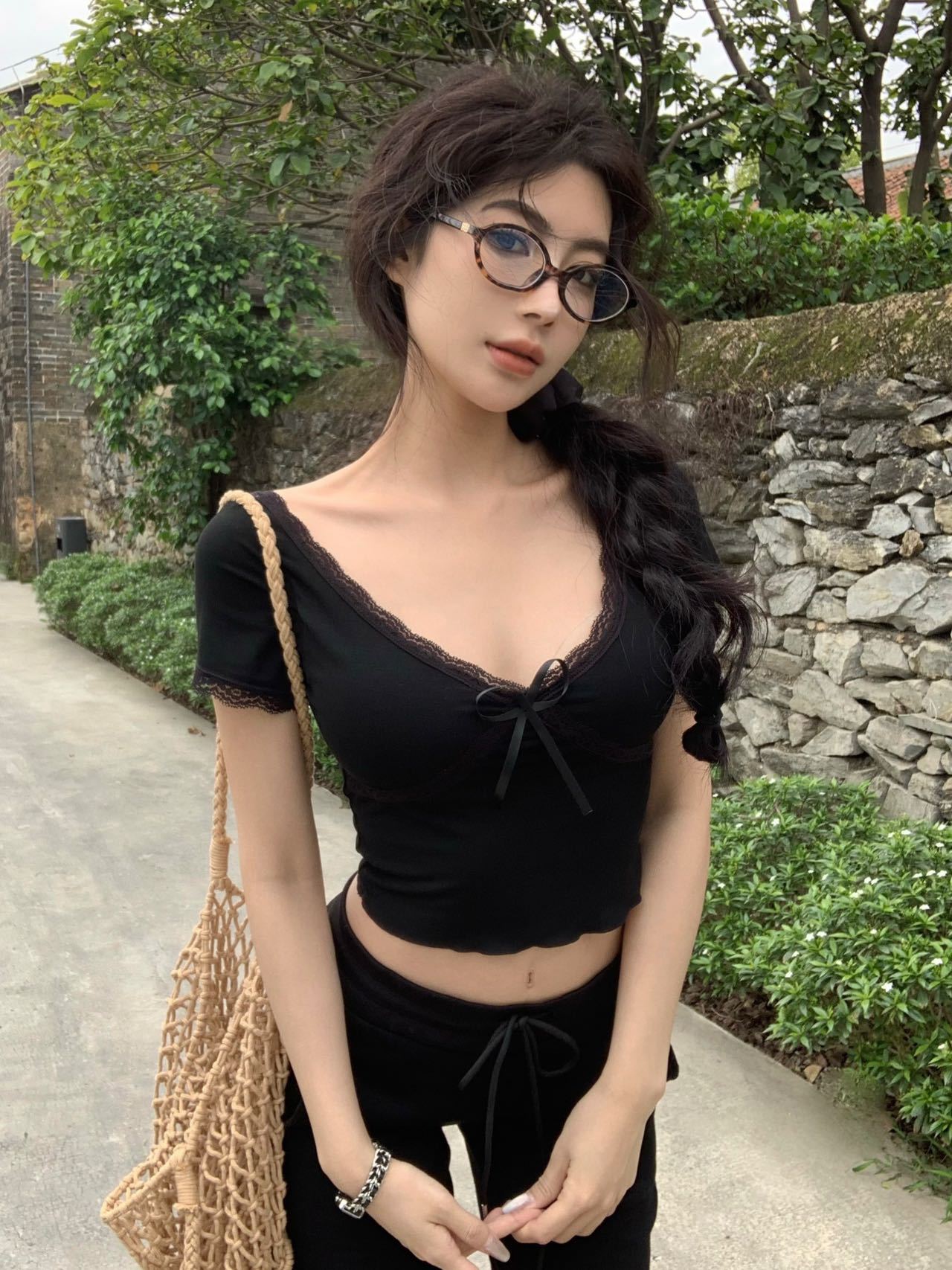 5010 # 새로운 레이스 V-넥 바느질 짧은 티셔츠 여성용 여름 슬림 핏 슬리밍 섹시한 스파이스 소녀 활 탑