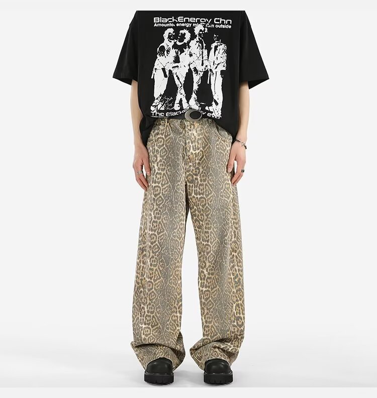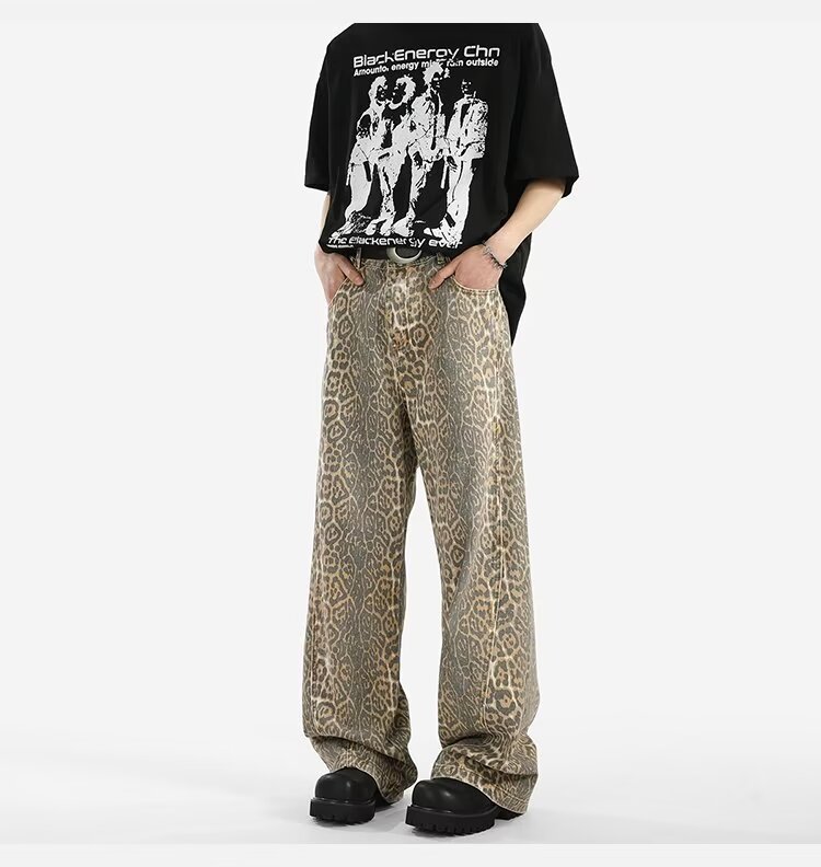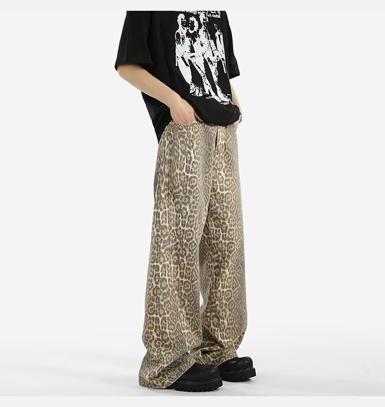 아메리칸 스타일 레트로 트리 나이트 라이트 컬러 레오파드 무늬 청바지 남성과 여성 스트레이트 레그 와이드 레그 팬츠 바이브 스타일 바지