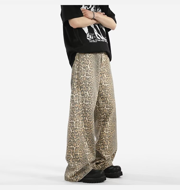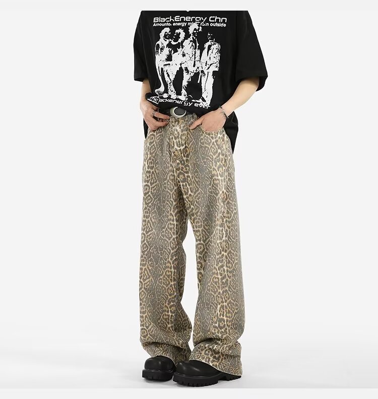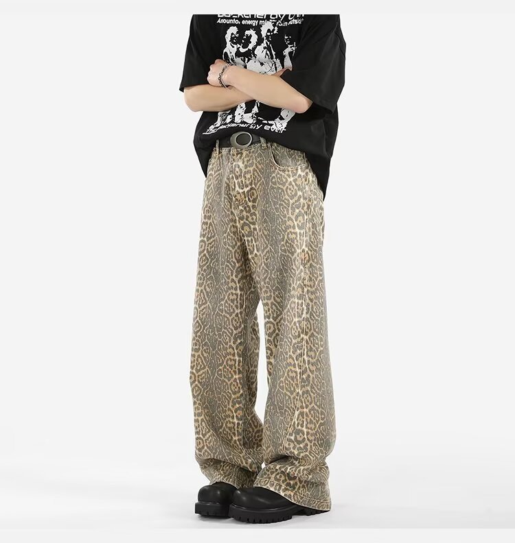 아메리칸 스타일 레트로 트리 나이트 라이트 컬러 레오파드 무늬 청바지 남성과 여성 스트레이트 레그 와이드 레그 팬츠 바이브 스타일 바지스토어 가기