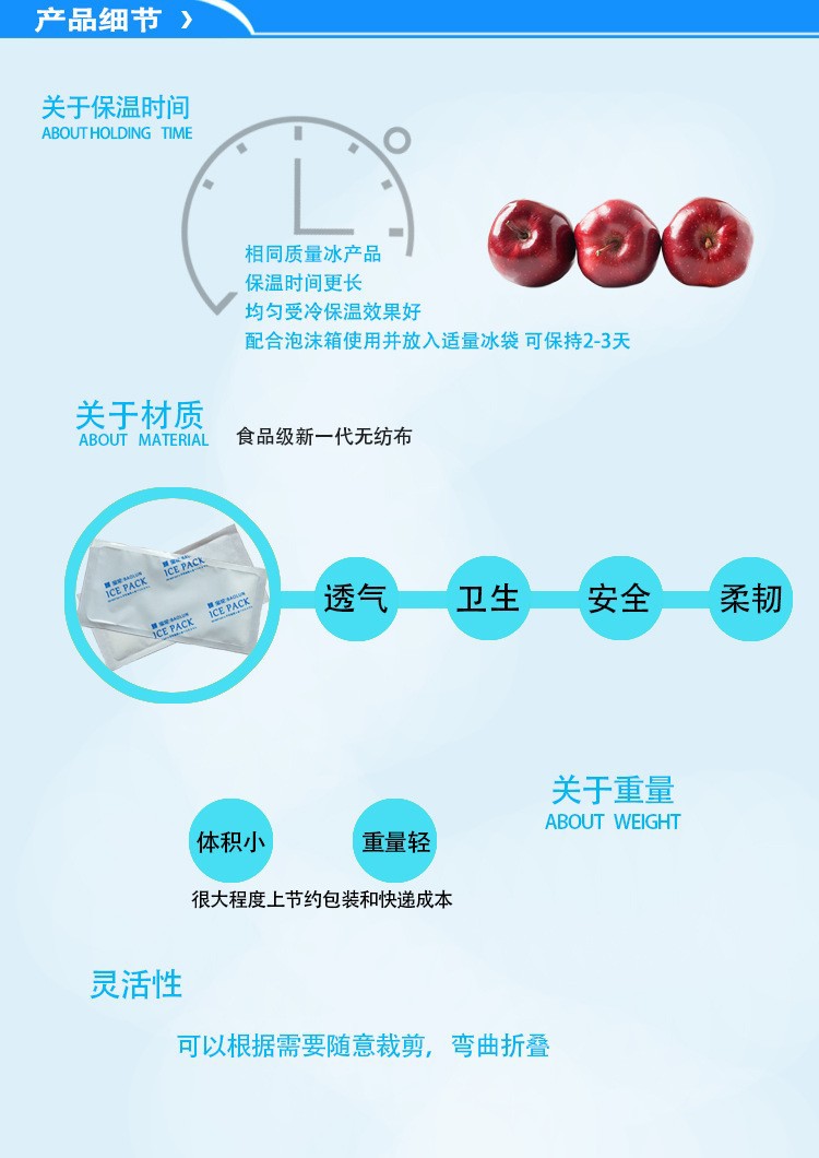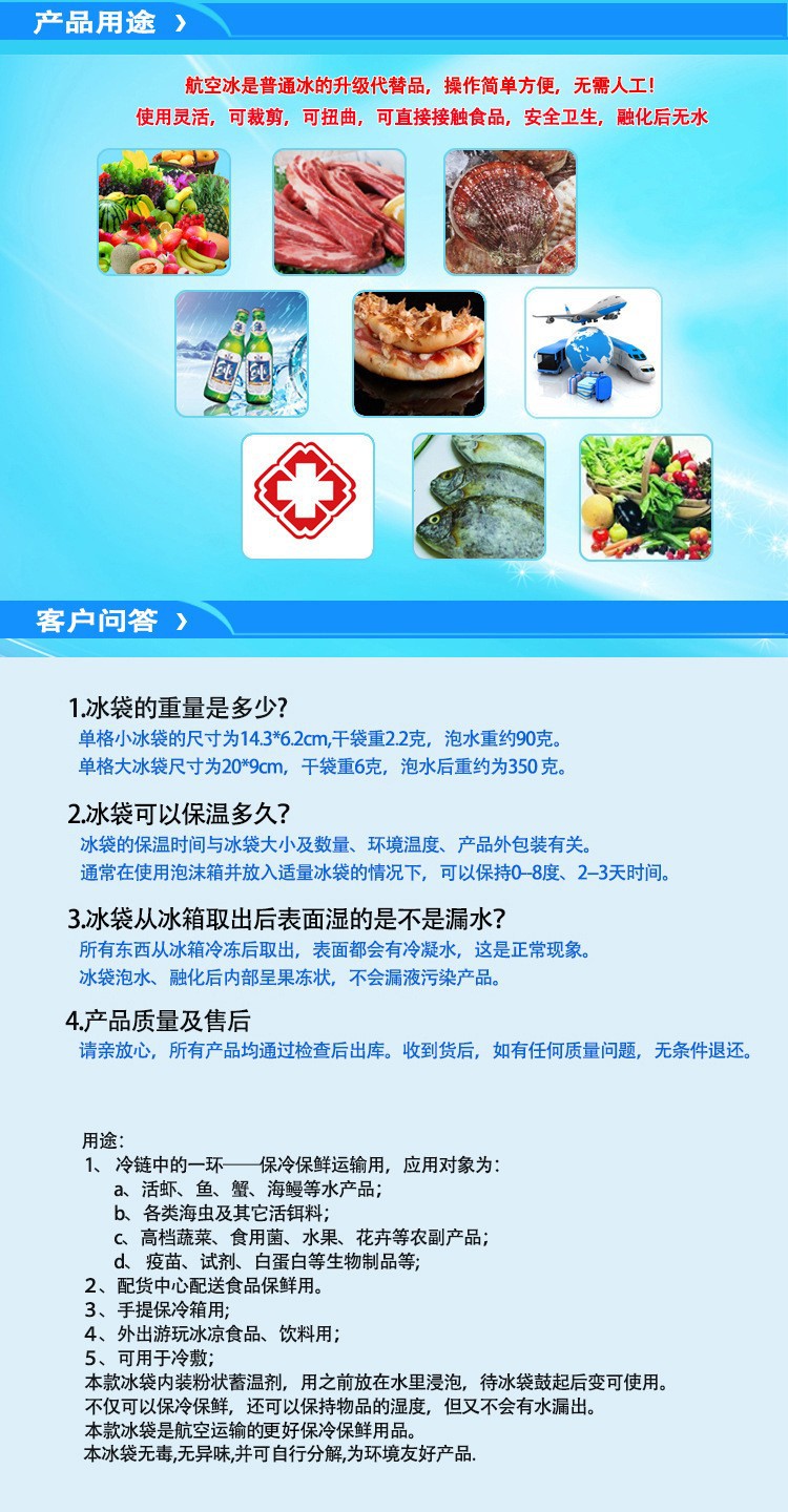冰袋为吸水型冰袋,使用前将本品浸入水中5分钟以上,待冰袋充分鼓起后取出并拧干多余水份,再后
