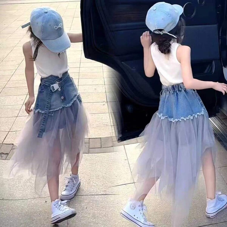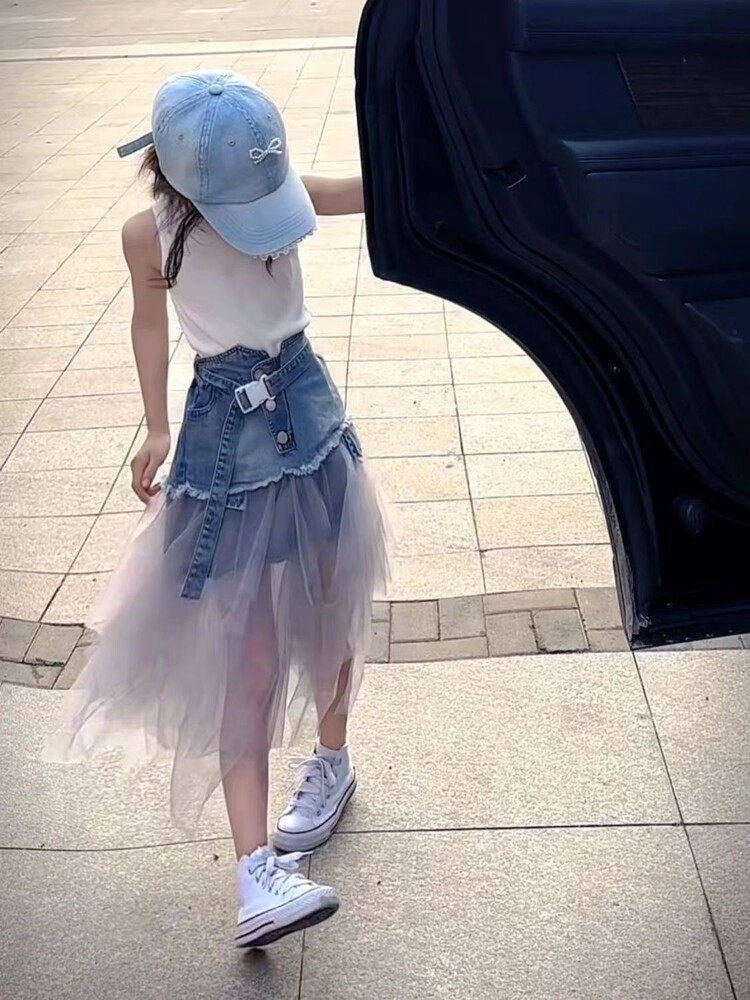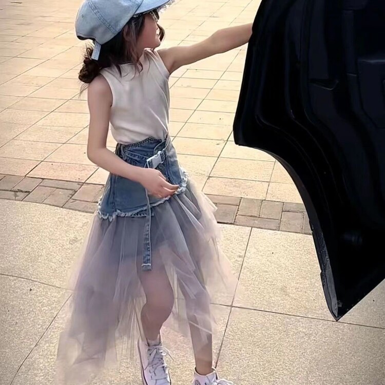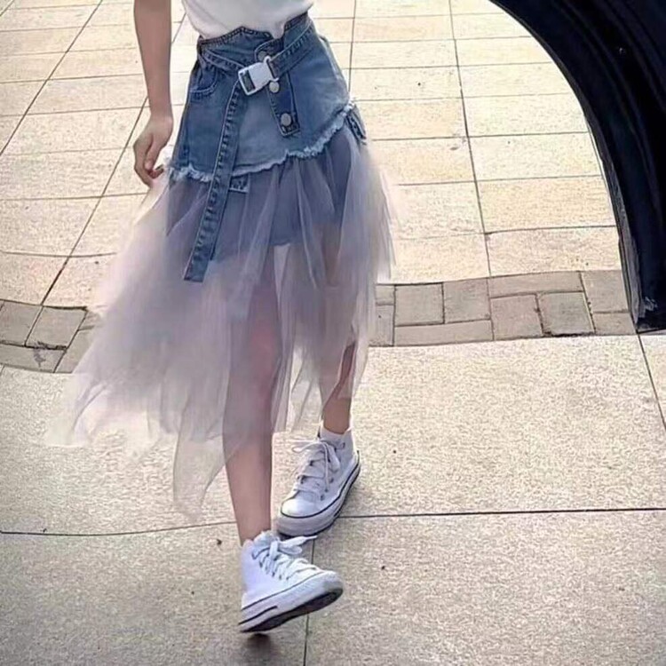 디자인 센스 데님 스커트 걸스 여름 새로운 슬리밍 스티칭 메쉬 높은 허리 A-라인 긴 스커트 트렌디