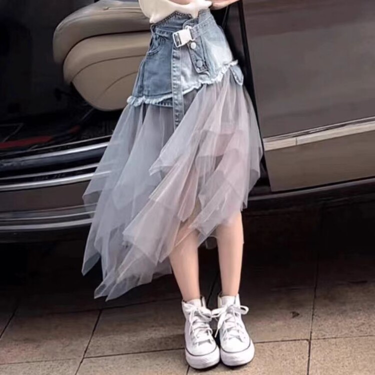 디자인 센스 데님 스커트 걸스 여름 새로운 슬리밍 스티칭 메쉬 높은 허리 A-라인 긴 스커트 트렌디스토어 가기
