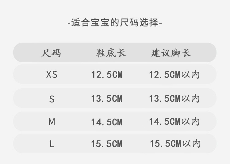 • XS는 12.5CM 미만의 발 길이에 적합합니다.