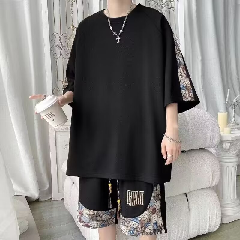 여름 새로운 국가 패션 자수 반팔 티셔츠 남성용 루즈 플러스 사이즈 패션 캐주얼 스포츠 세트 바지 세트스토어 가기