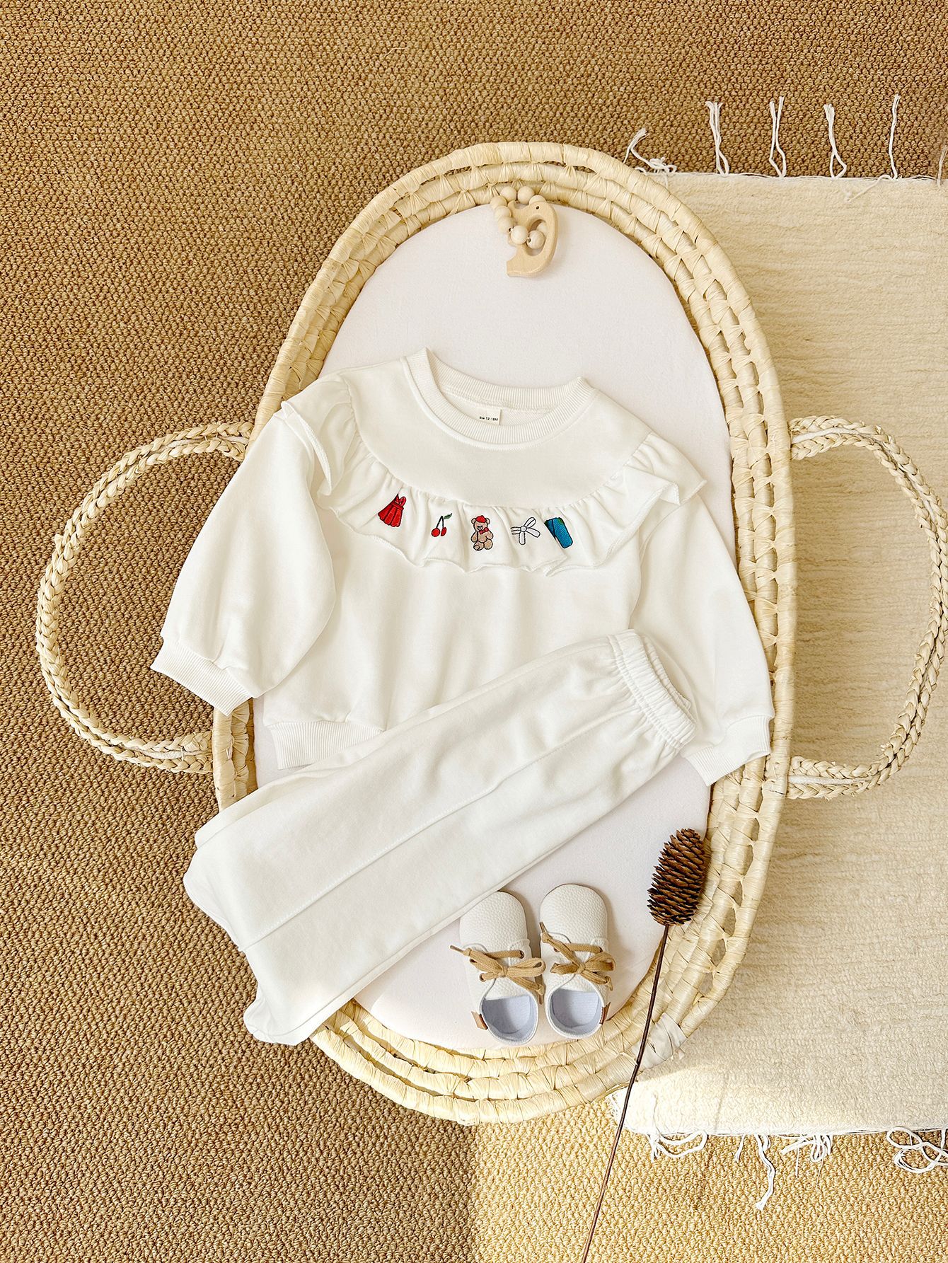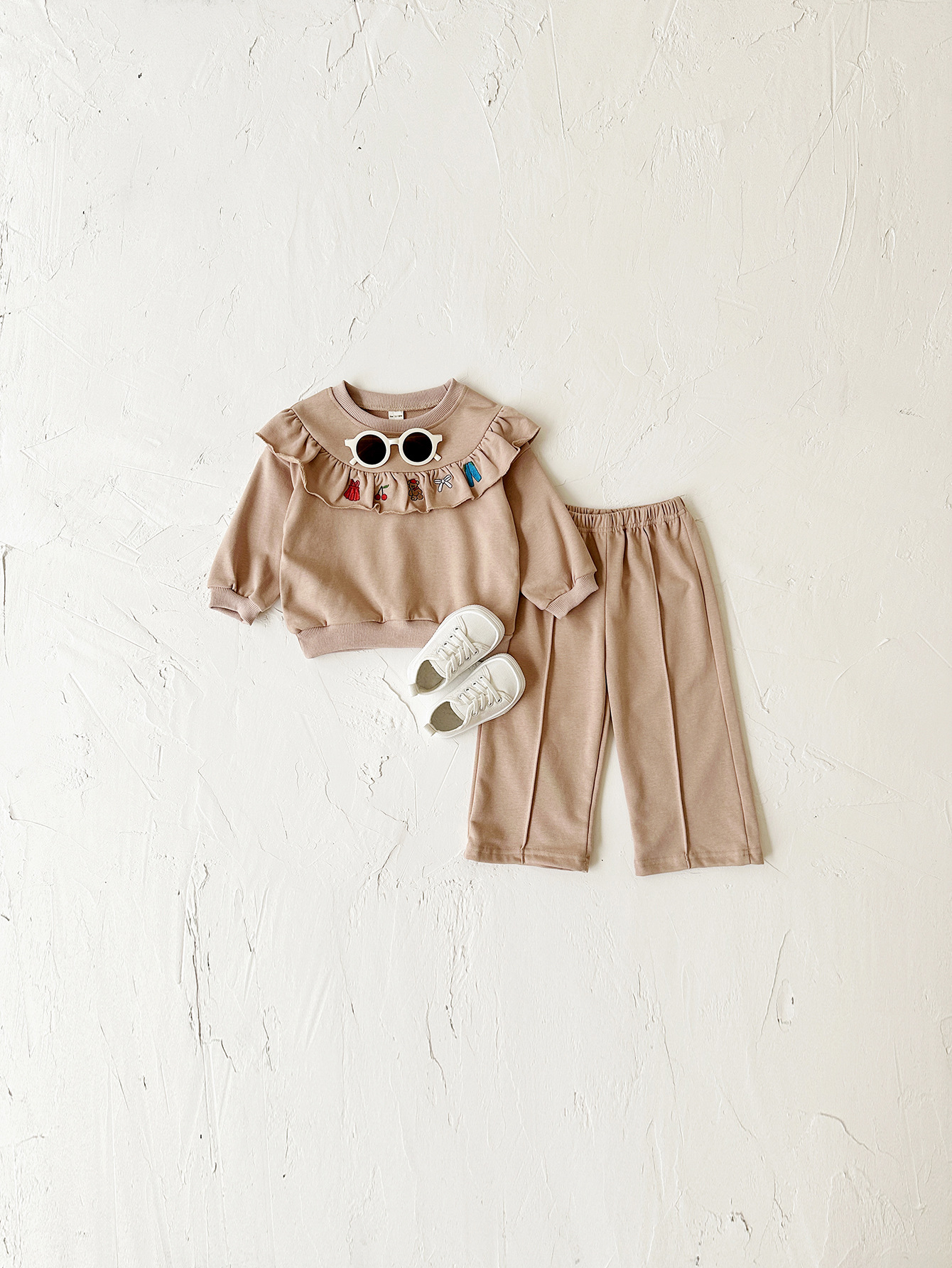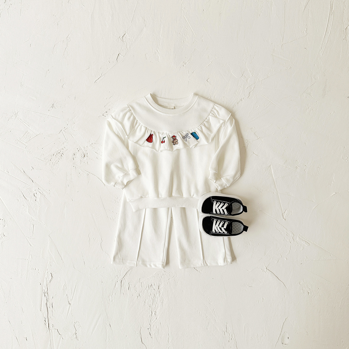INS 한국 스타일 봄과 가을 소녀 자수 러플 스웨트 셔츠 투피스 세트 아기 크루 넥 풀오버 긴 소매 세트 크로스 보더스토어 가기