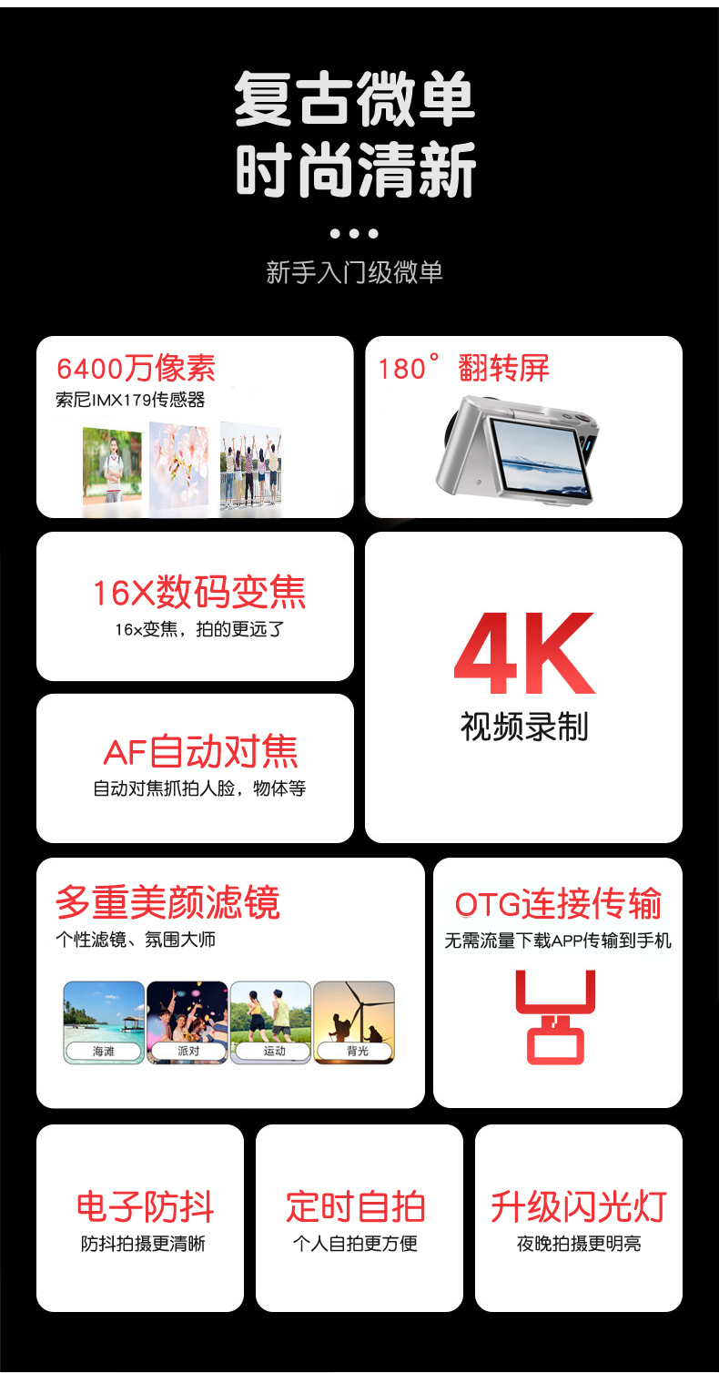 4K 높은 픽셀 학생 파티 캠퍼스 플립 스크린 셀카 마이크로 단일 사진 비디오 엔트리 레벨 디지털 카메라 vlog