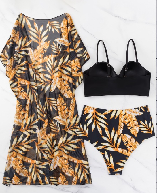 공장 가공 맞춤형 국경 간 새로운 단풍잎 프린트 하이 웨이스트 메쉬 재킷 슬리밍 비키니 대외 무역 수영복