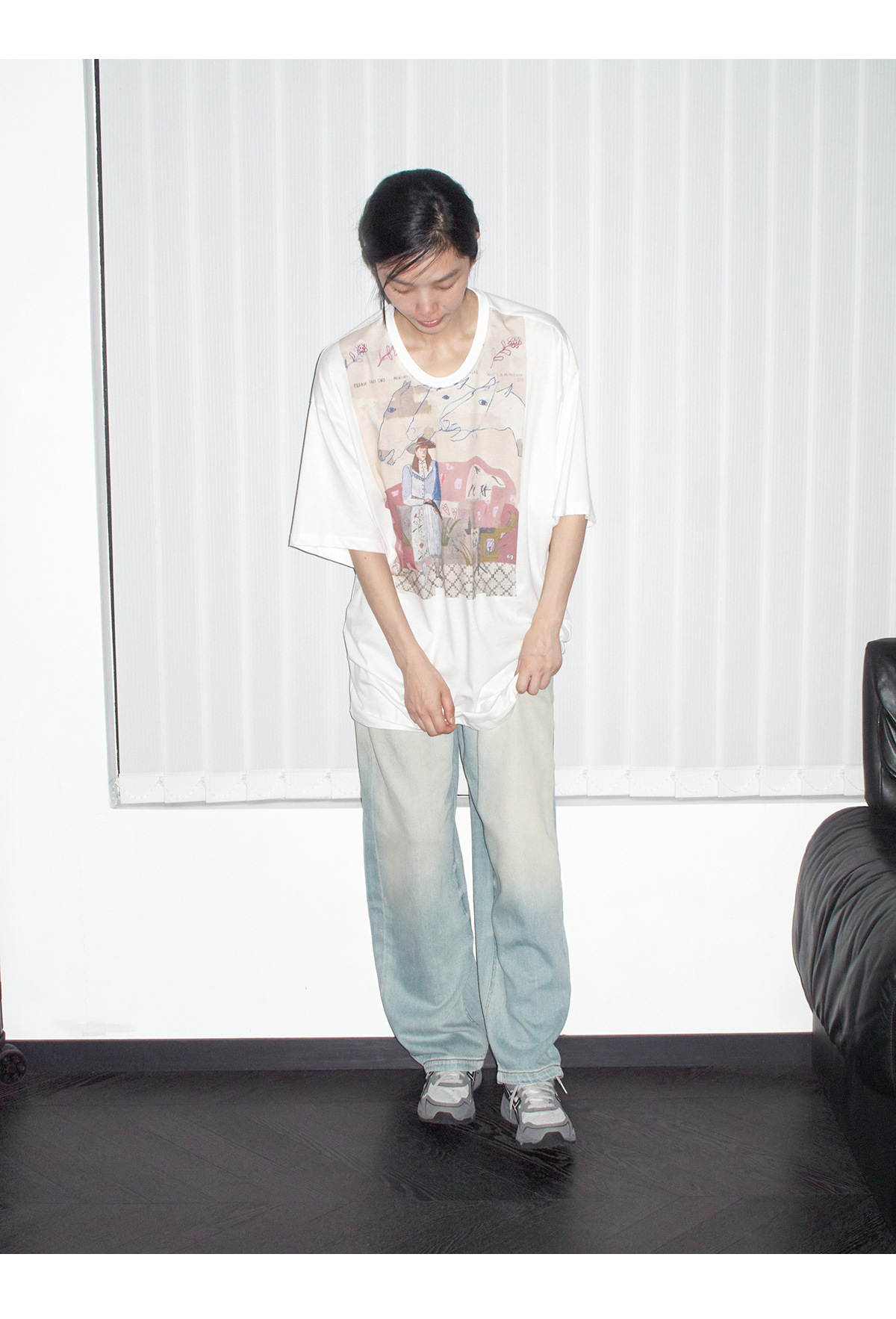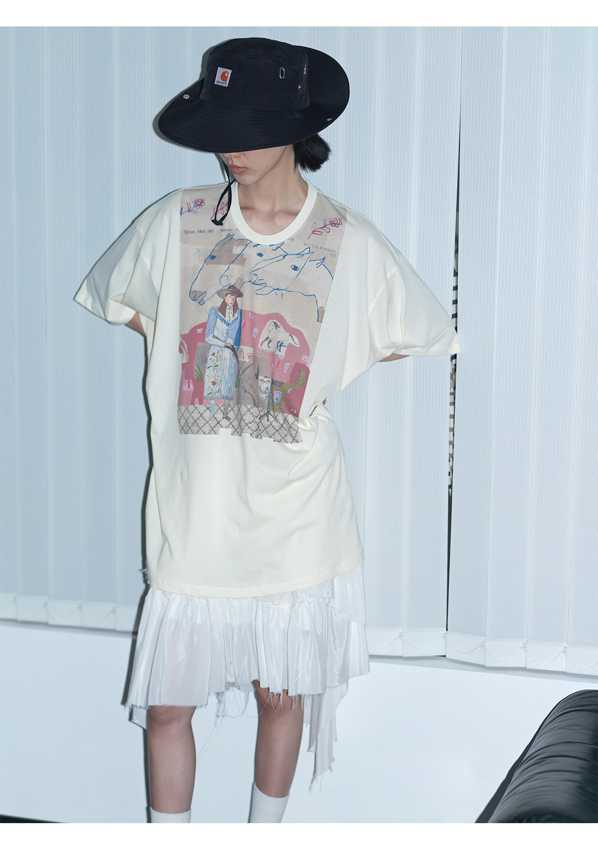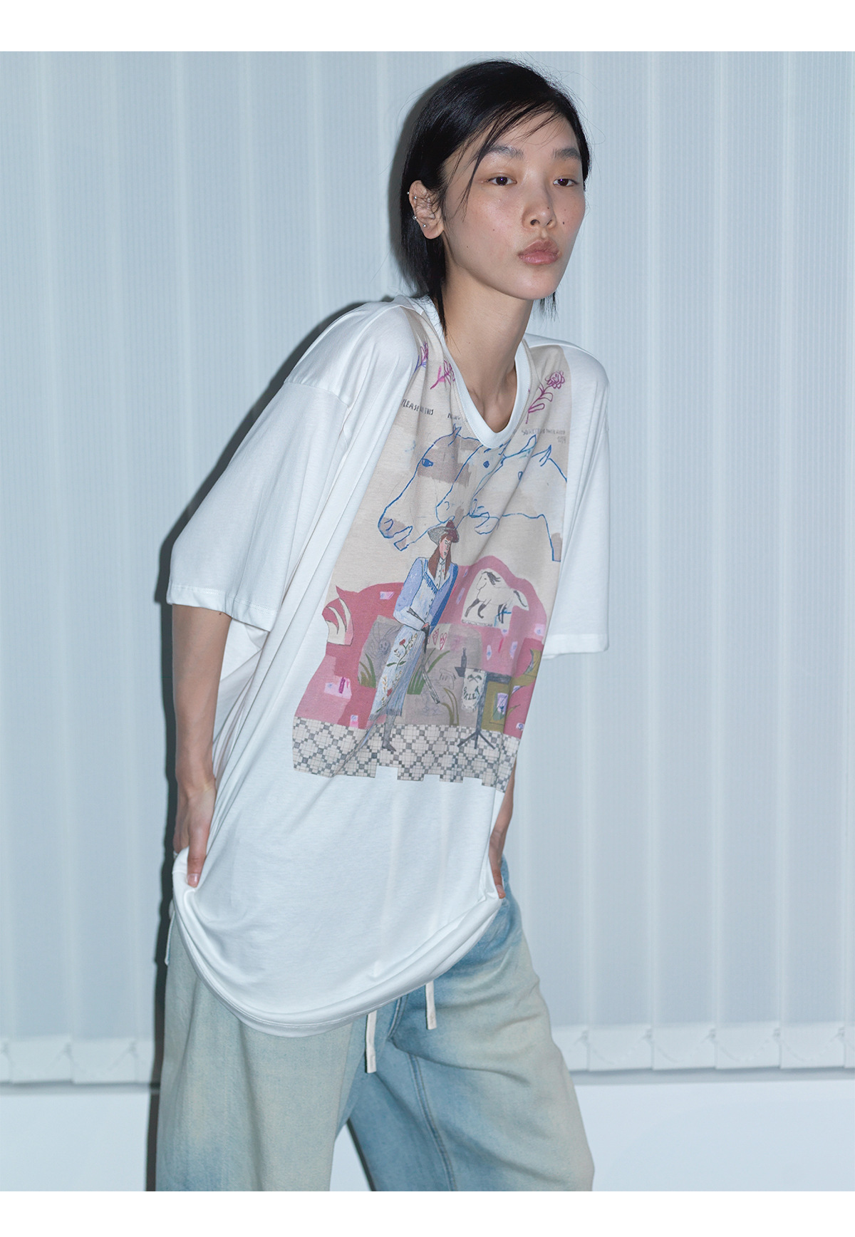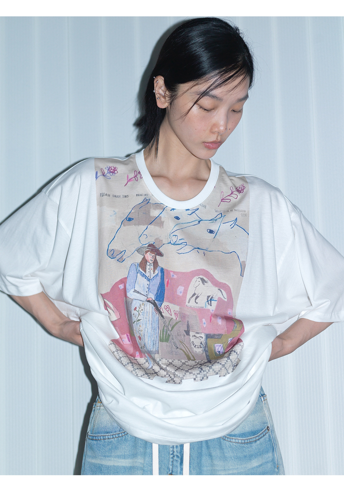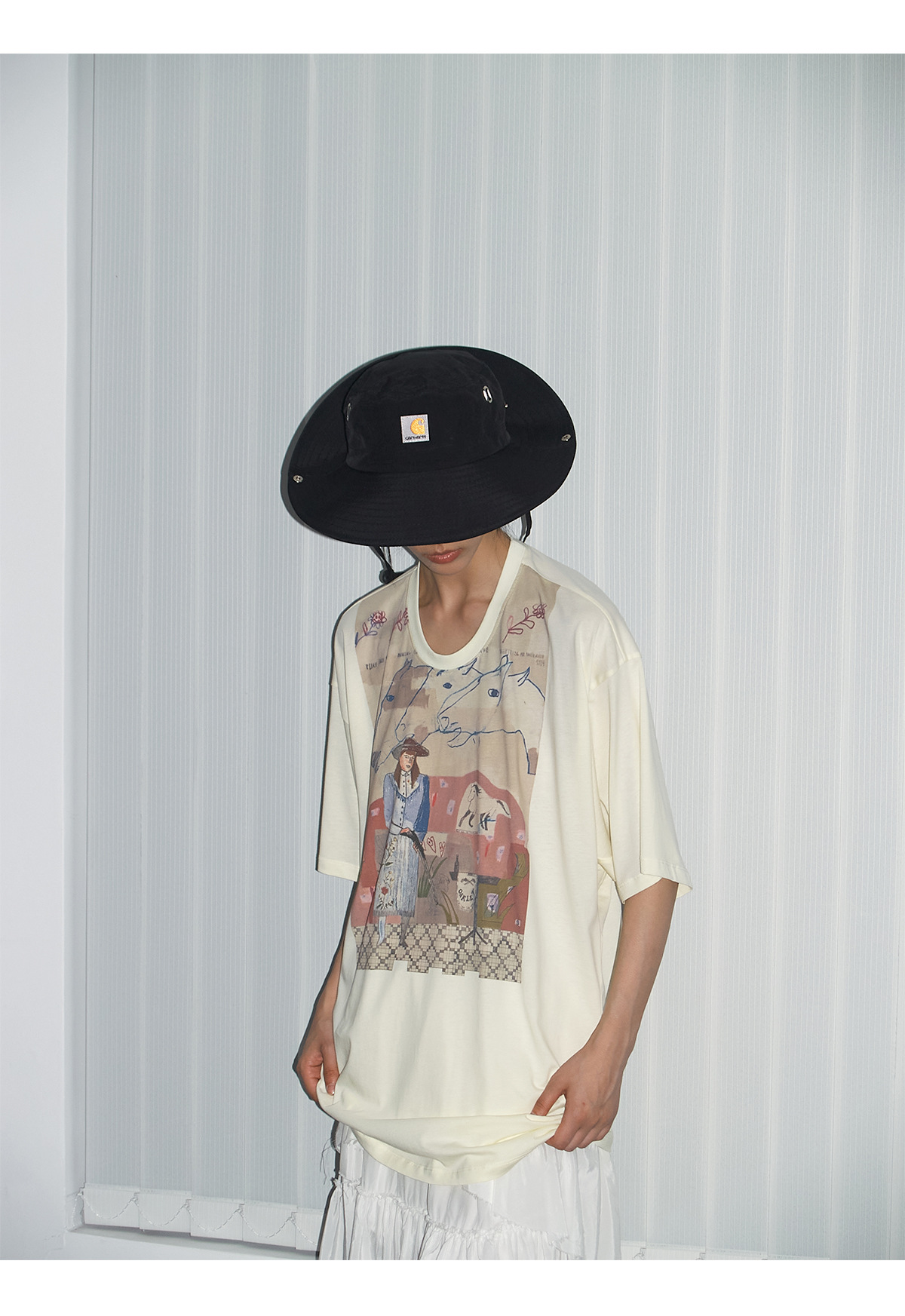 [시간 방문] 뉴 퓨어 코튼 루즈 다재다능한 탑 터틀 백 플랫 컷 애니메이션 프린트 라운드 넥 7부소매 티셔츠 V6586