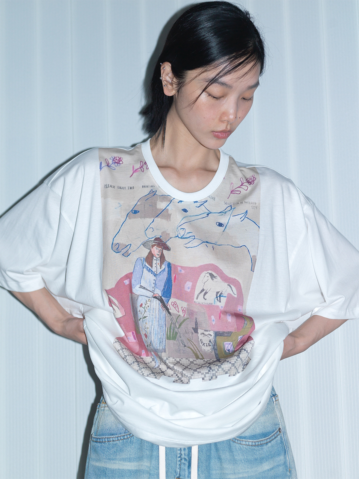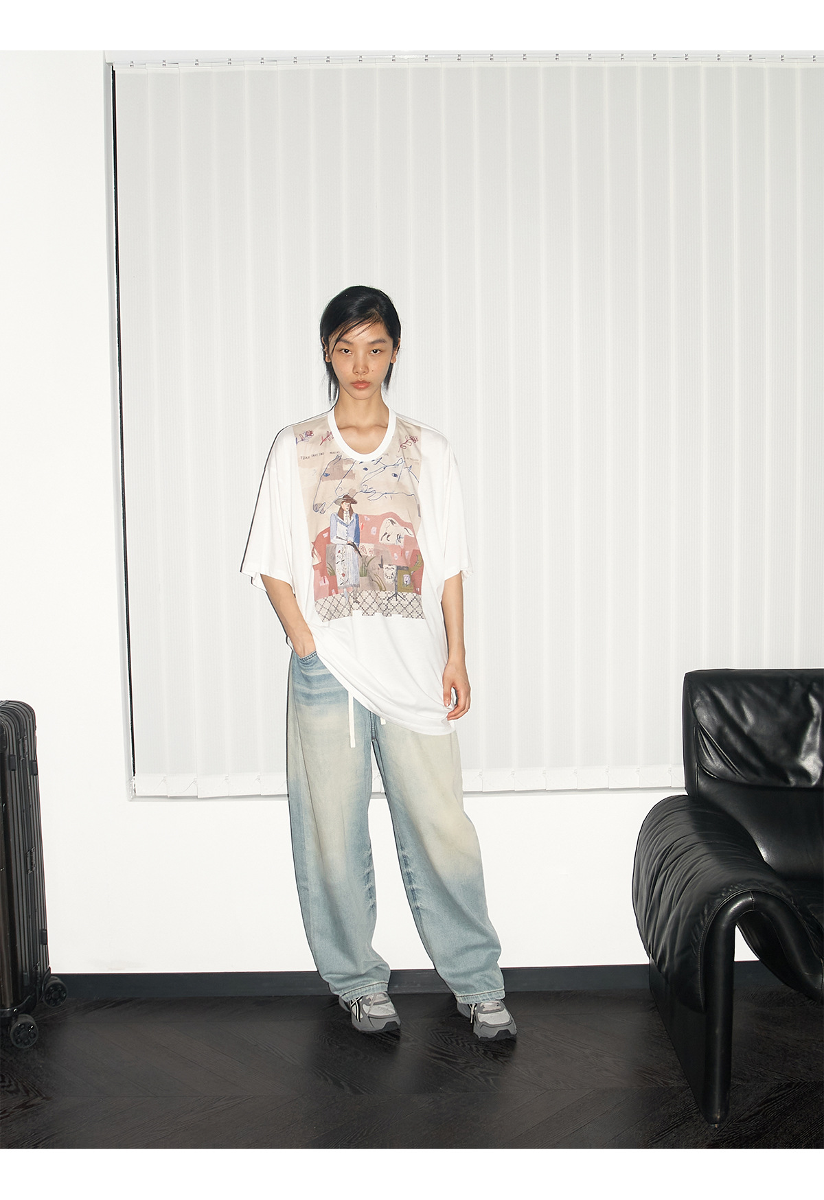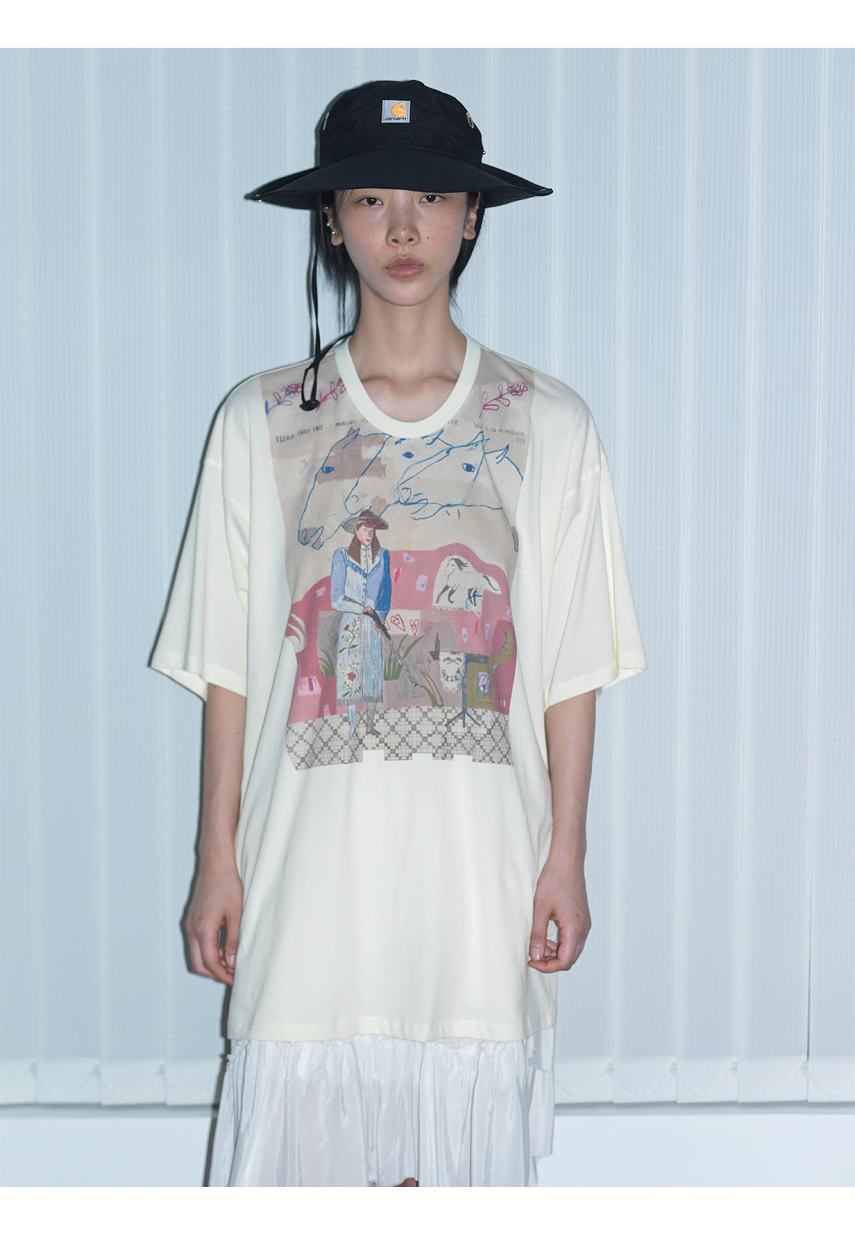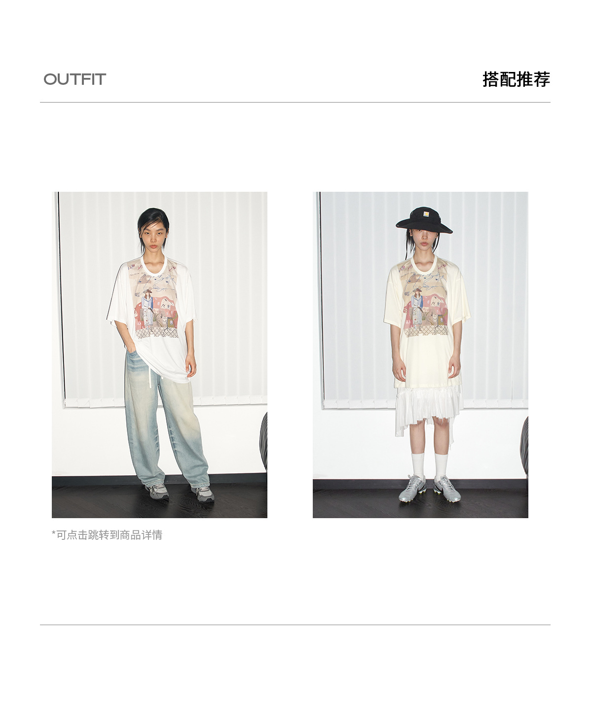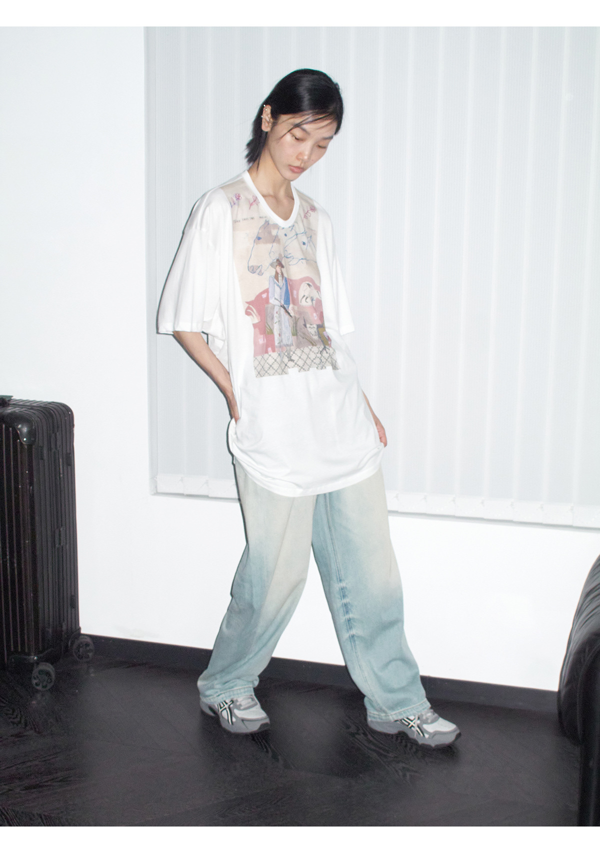 [시간 방문] 뉴 퓨어 코튼 루즈 다재다능한 탑 터틀 백 플랫 컷 애니메이션 프린트 라운드 넥 7부소매 티셔츠 V6586