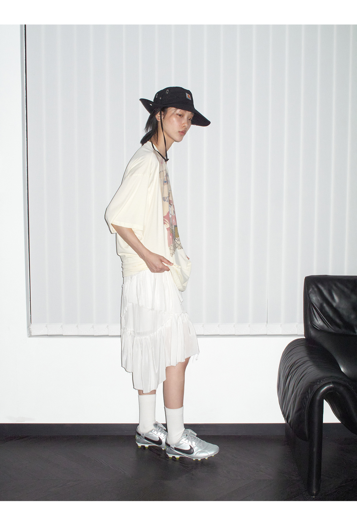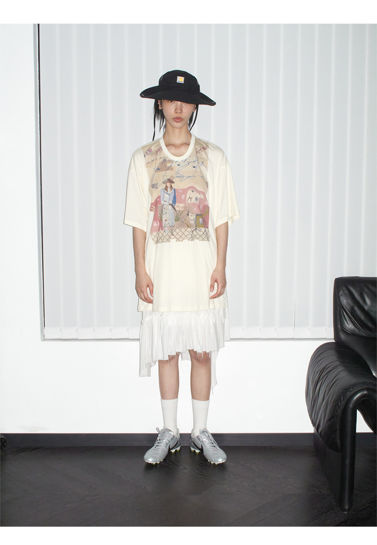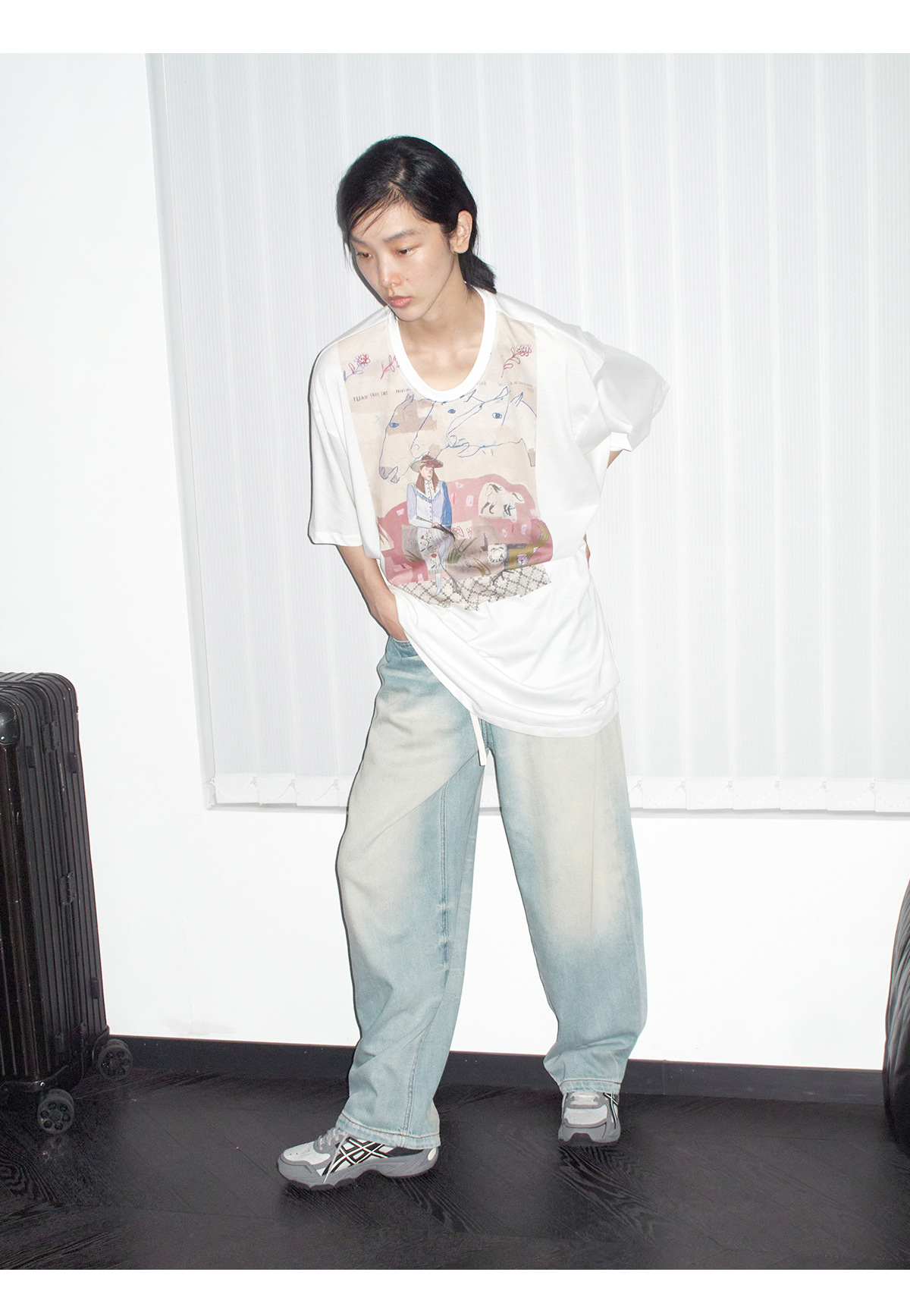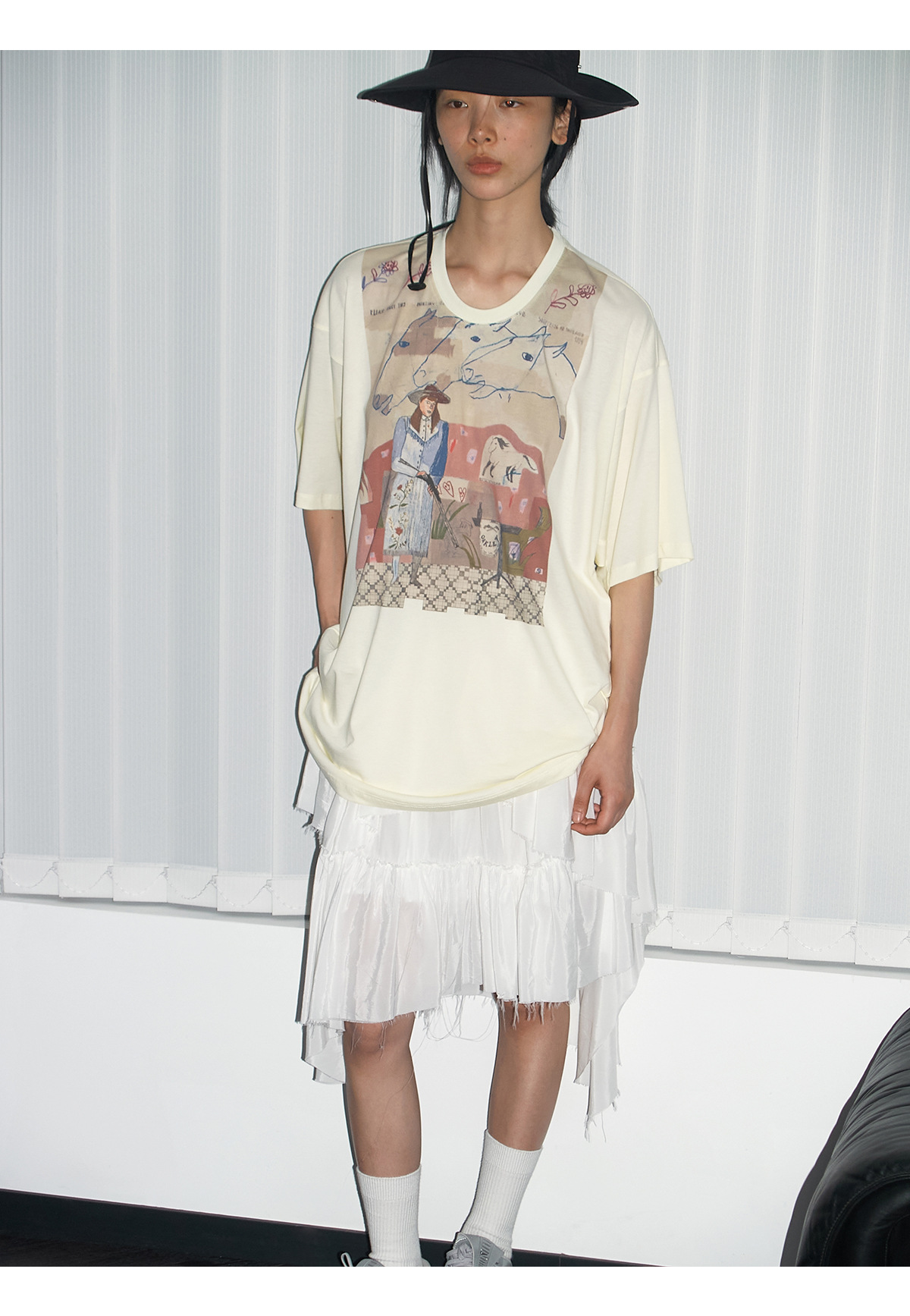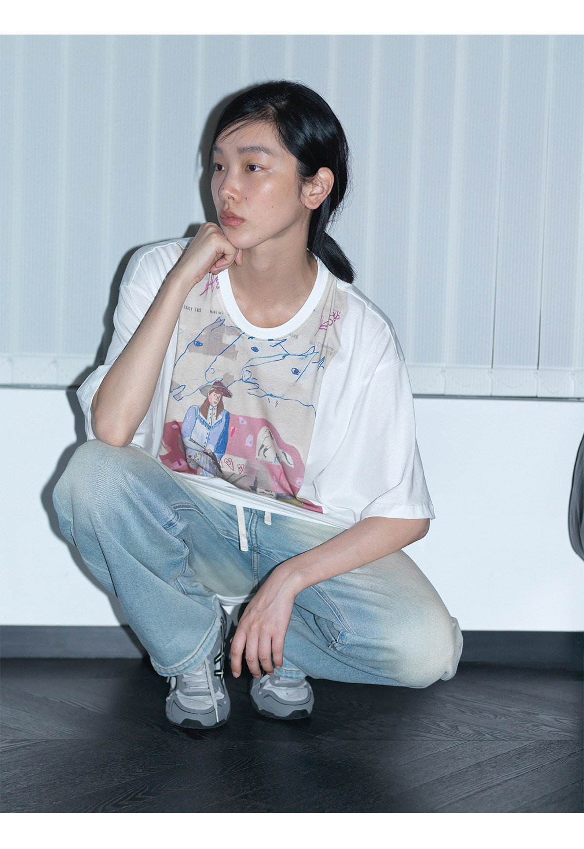 [시간 방문] 뉴 퓨어 코튼 루즈 다재다능한 탑 터틀 백 플랫 컷 애니메이션 프린트 라운드 넥 7부소매 티셔츠 V6586