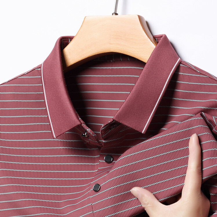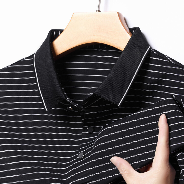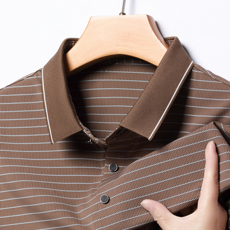 2024夏季冰丝短袖t恤男翻领纽扣条纹中年爸爸装商务休闲上衣
