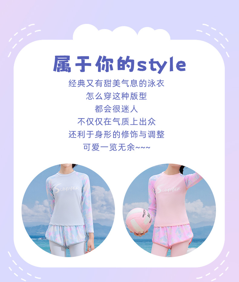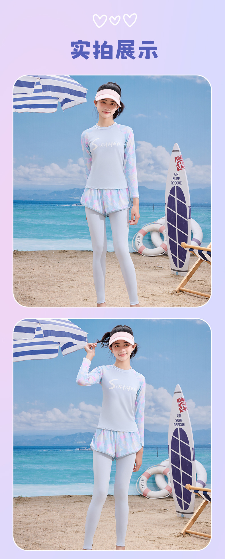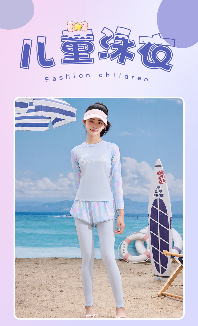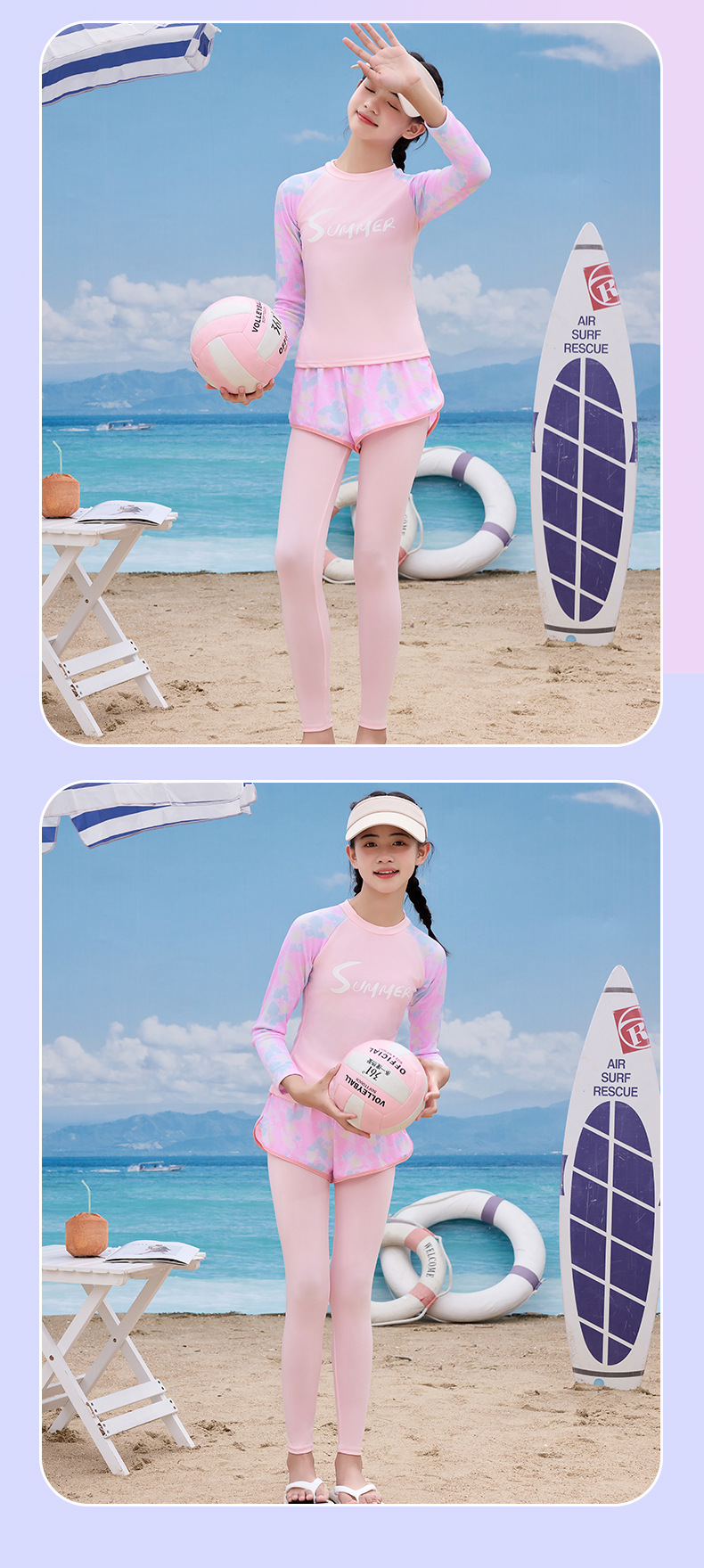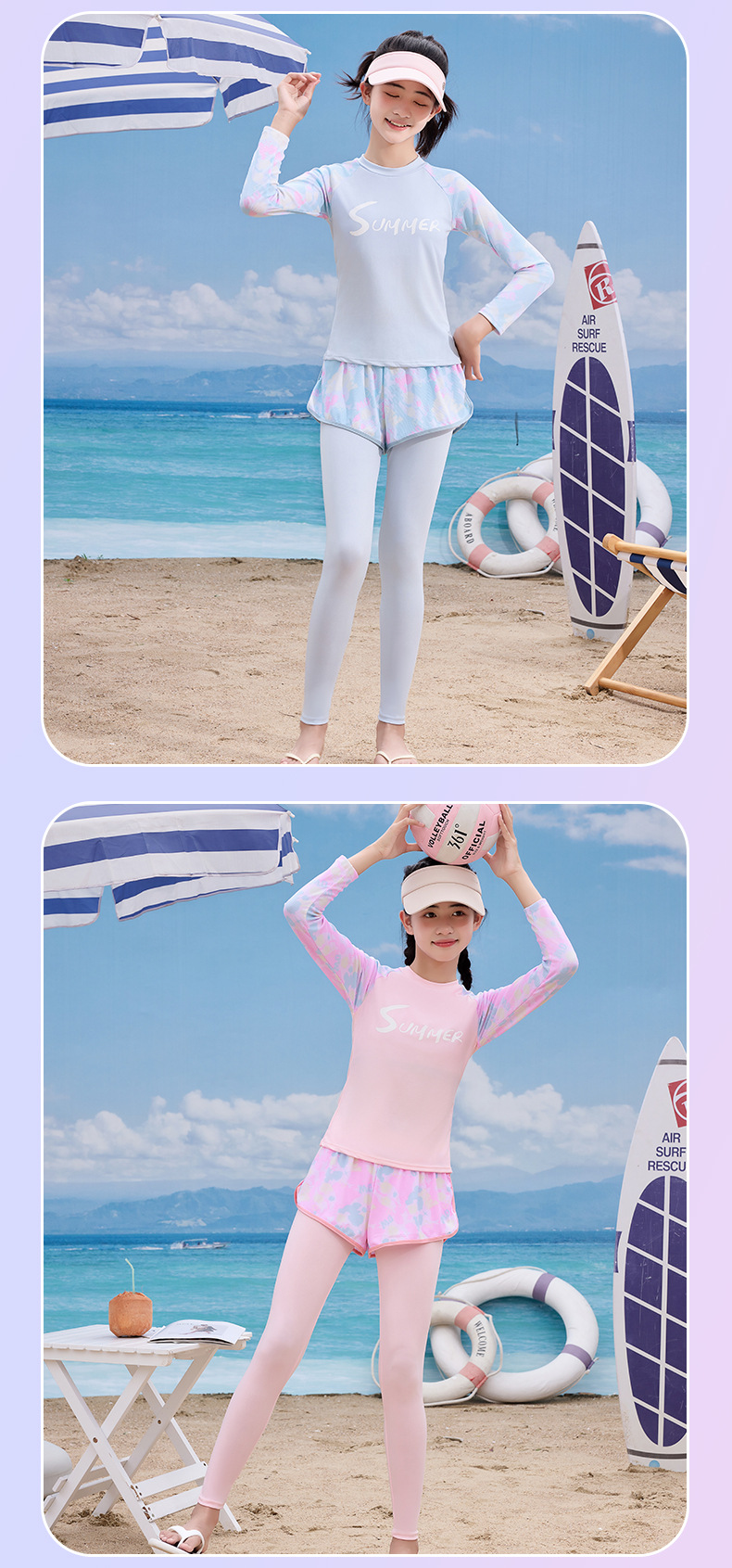 어린이 수영복 소녀의 쪼개진 긴 소매 바지 태양 방지 수영복 2024 새로운 스타일 중 및 대형 어린이 소녀 온천 세트