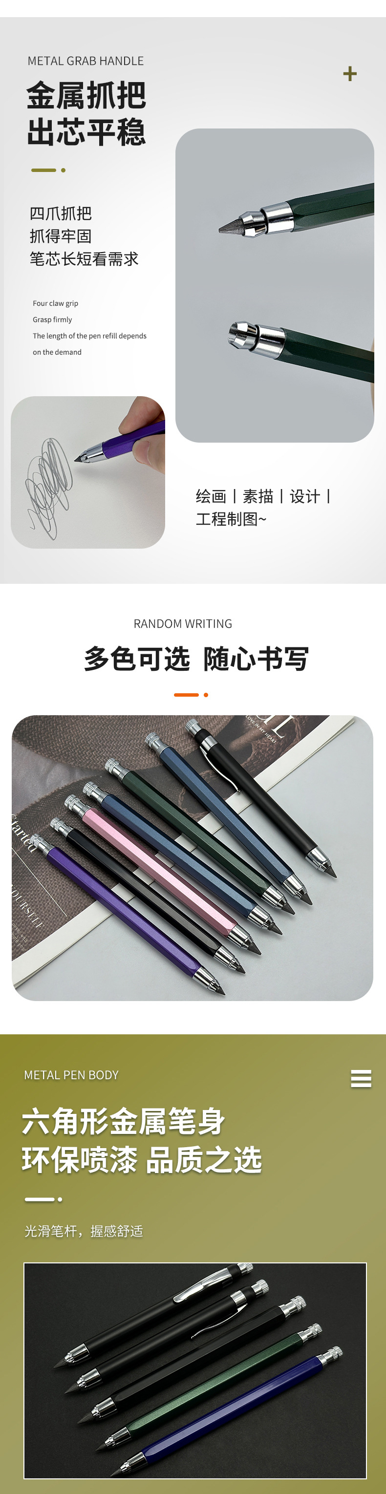 국경 간 재고 로고 스케치 만화 손으로 그린 금속 육각형 5.6MM 및 4.0MM 자동 연필을 주문할 수 있습니다.스토어 가기