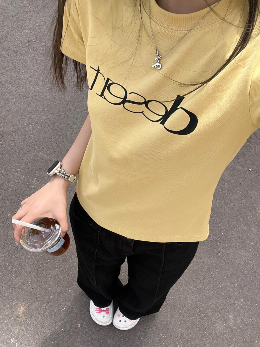 [40 210g 빗질 95% 면 + 5% 스판덱스 백 칼라] 슬림 핏 슬림 숄더 반소매 티셔츠 여성용 라이트 옐로우스토어 가기
