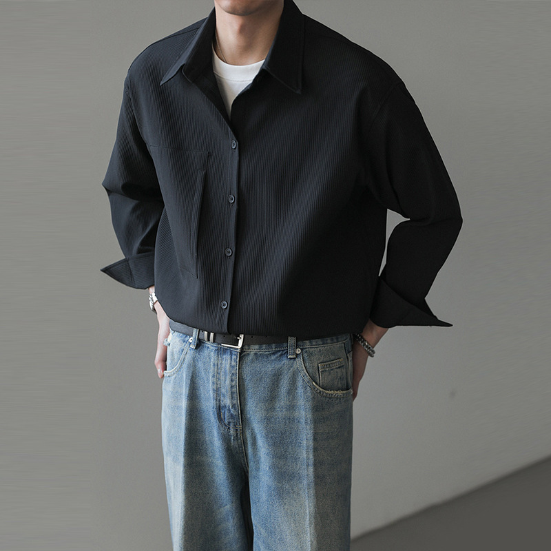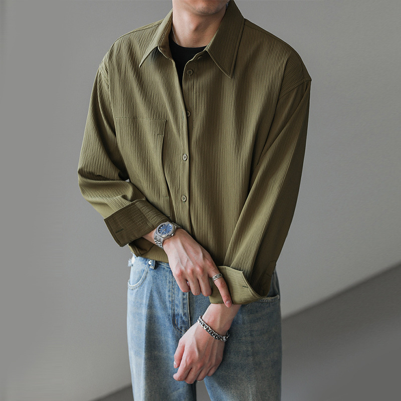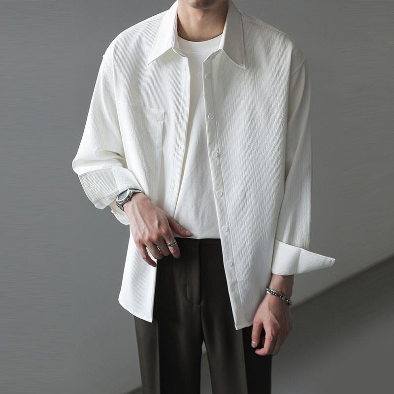 수직 줄무늬 질감 긴팔 셔츠 남자의 봄과 가을 느슨한 프로필 포장 된 구덩이 질감 셔츠 재킷
