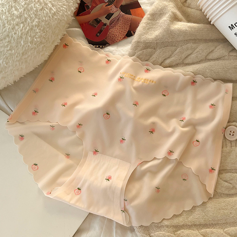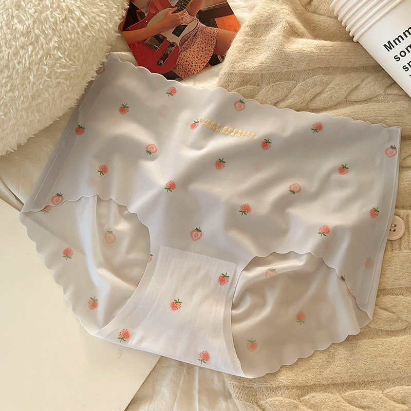 여름 빠른 건조 추적없는 아이스 실크 속옷 여성의 중간 허리 울트라 얇은 마스크 바지 뽕나무 실크 크로트 딸기 인쇄 여성 속옷스토어 가기