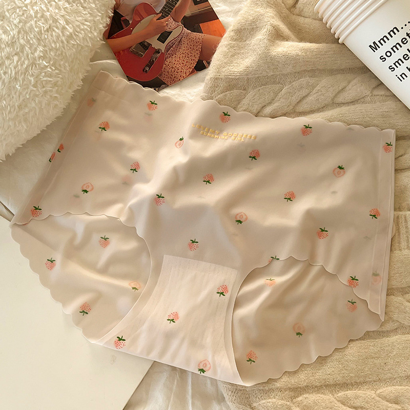 여름 빠른 건조 추적없는 아이스 실크 속옷 여성의 중간 허리 울트라 얇은 마스크 바지 뽕나무 실크 크로트 딸기 인쇄 여성 속옷