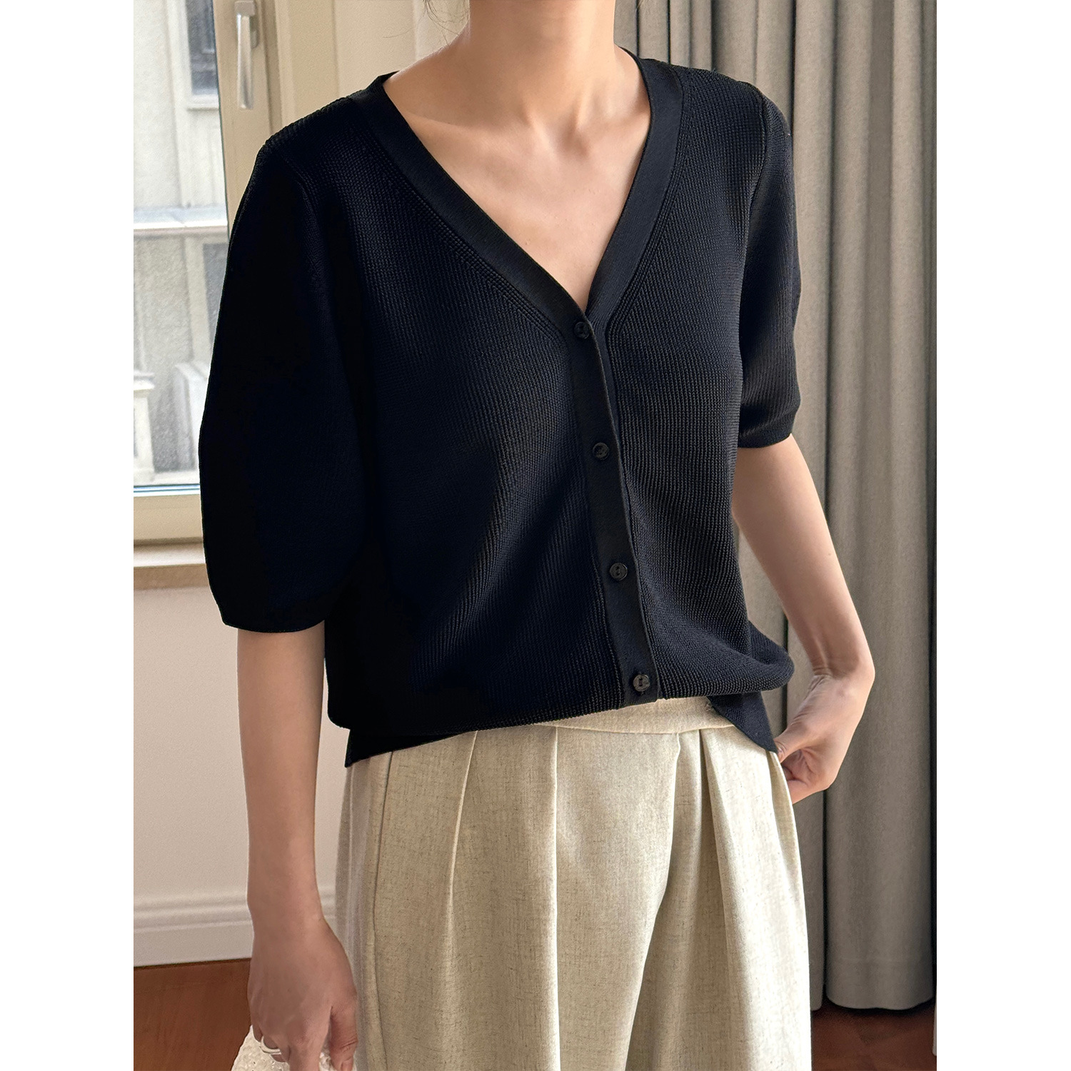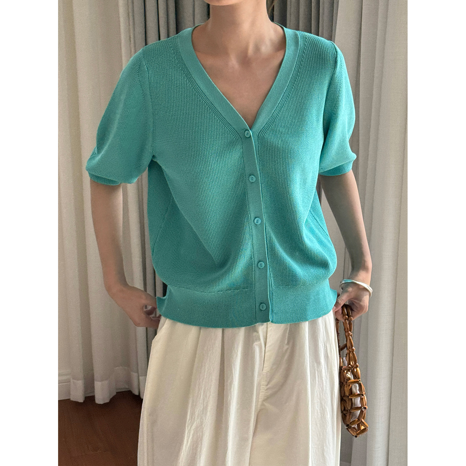 루브르 여름 새로운 한국 스타일 레트로 간단한 V 넥 니트 카디건 부드러운 왁스 가죽 친화적 인 여성용 편안한 탑스토어 가기