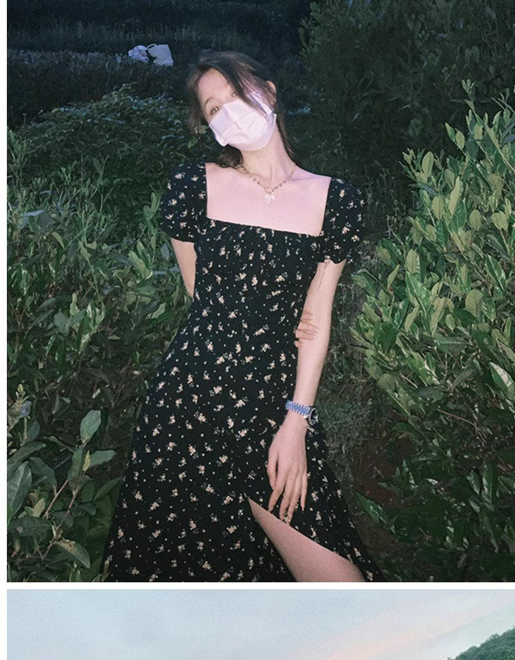 2024 년 새로운 여름 프랑스 광장 칼라 블랙 플로랄 원피스 슬리밍 티 브레이크 스플리트 놀라운 원피스스토어 가기