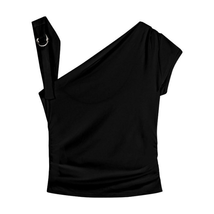 Ins 디자인 센스 섹시한 스파이스 소녀 싱글 숄더 짧은 티셔츠 여성용 슬림 어깨 슬림 슬림 짧은 소매 탑 여성 T 트렌디 도매
