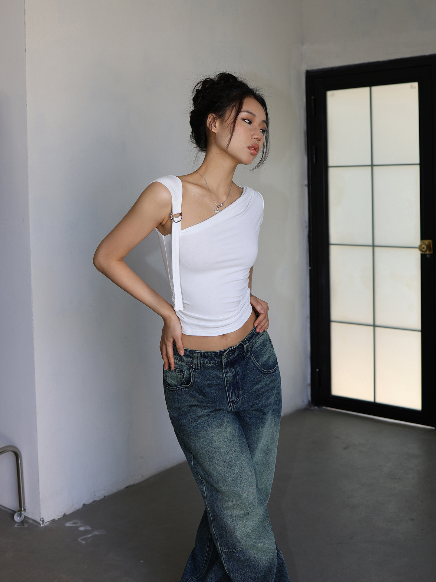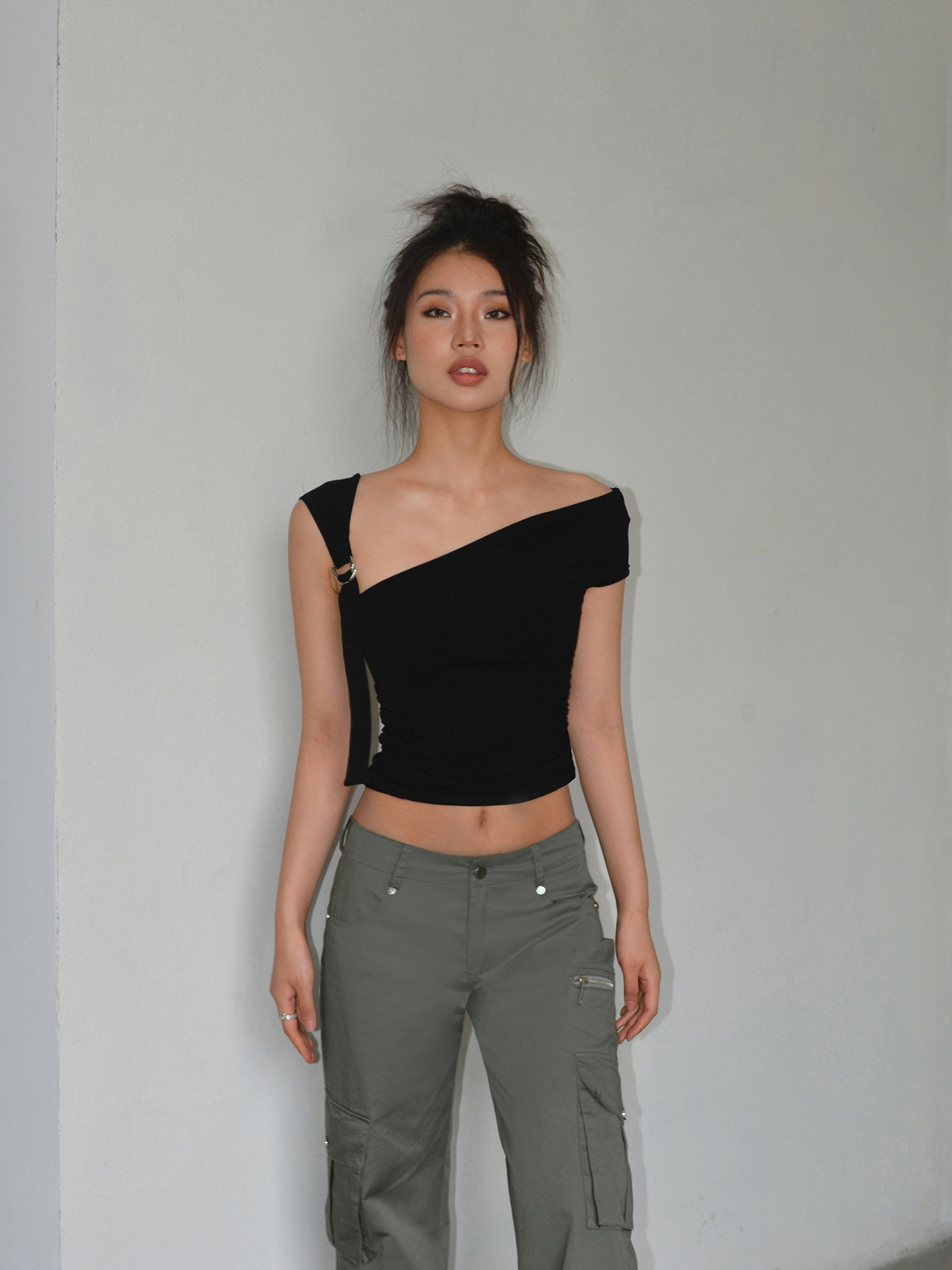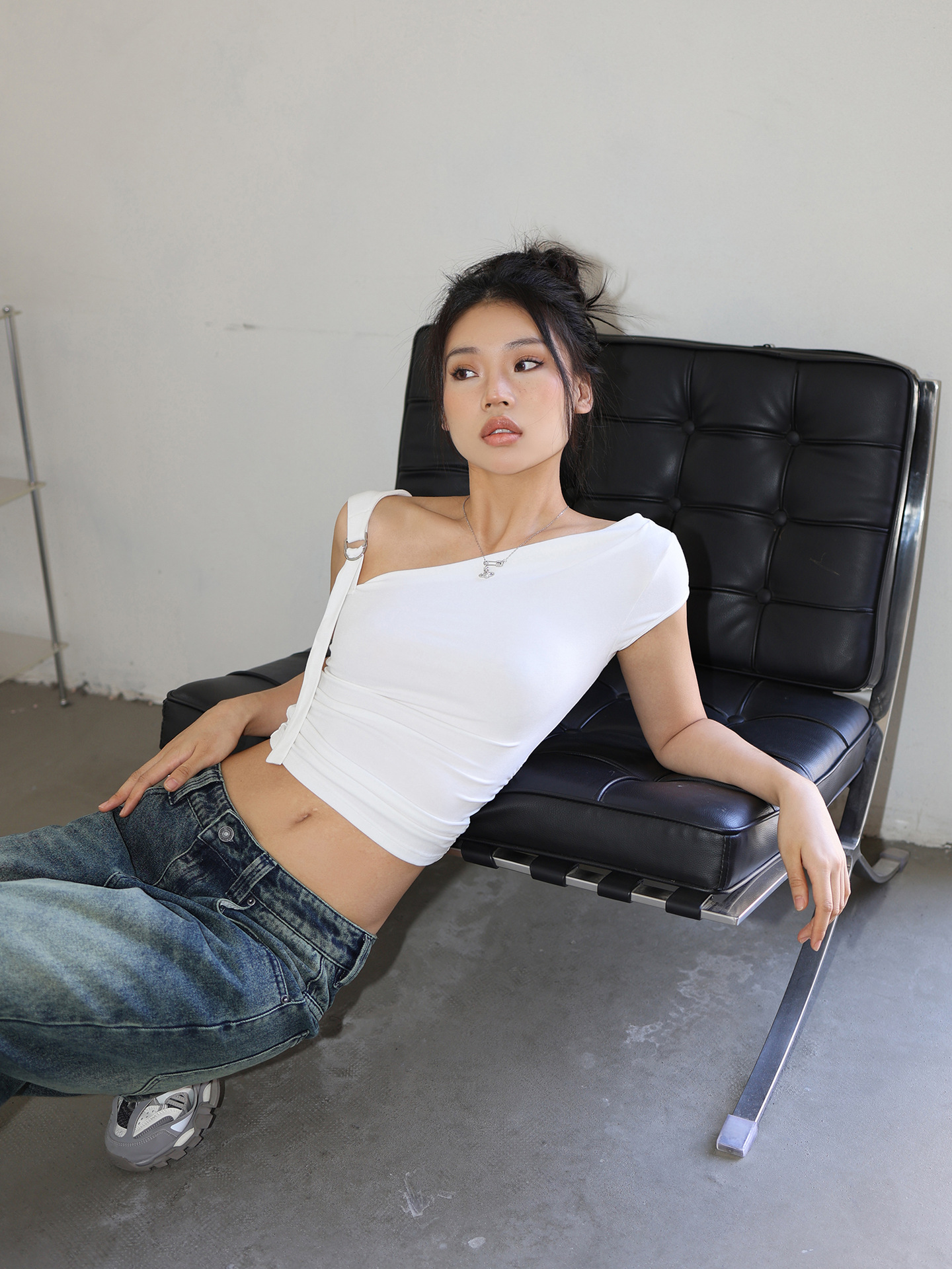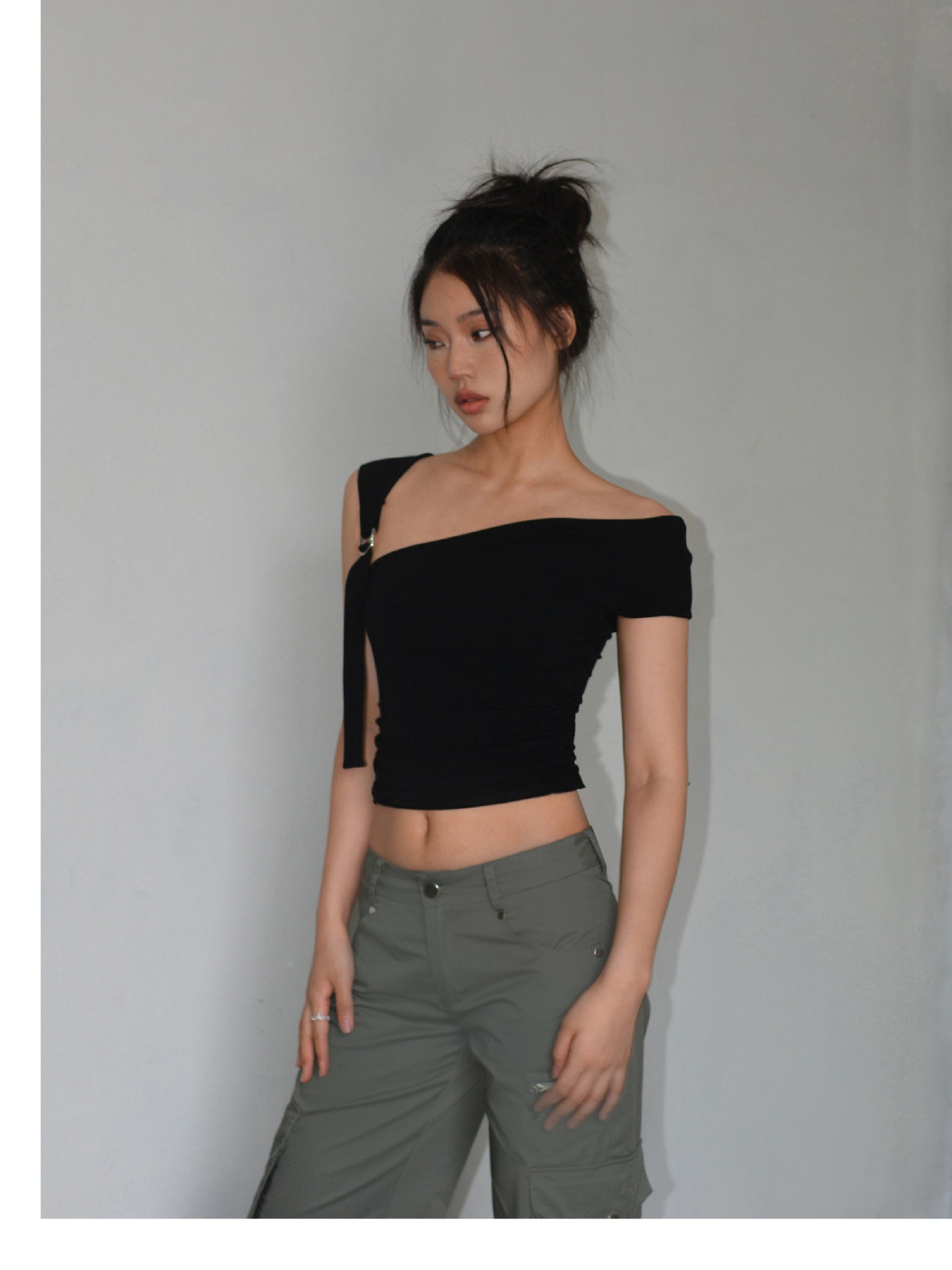 Ins 디자인 센스 섹시한 스파이스 소녀 싱글 숄더 짧은 티셔츠 여성용 슬림 어깨 슬림 슬림 짧은 소매 탑 여성 T 트렌디 도매스토어 가기