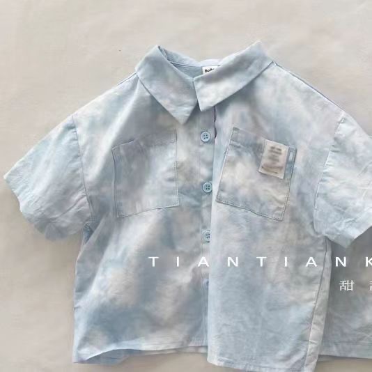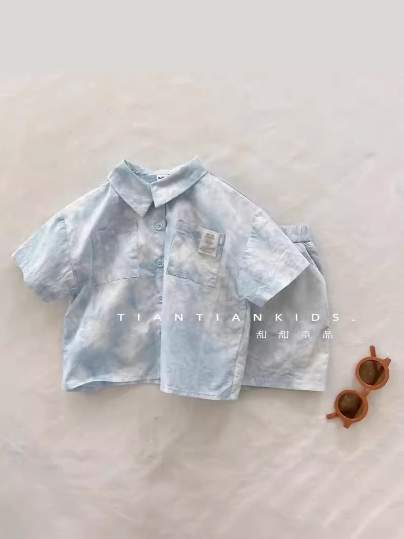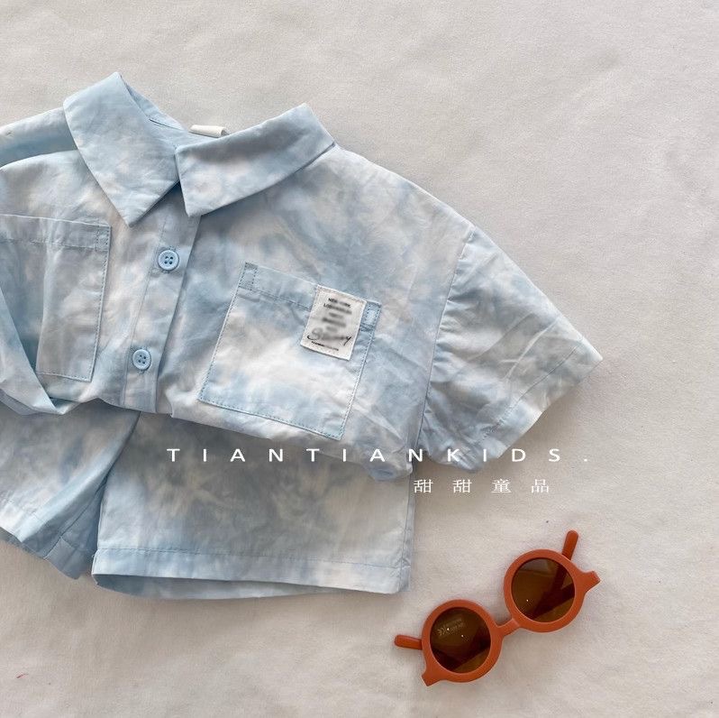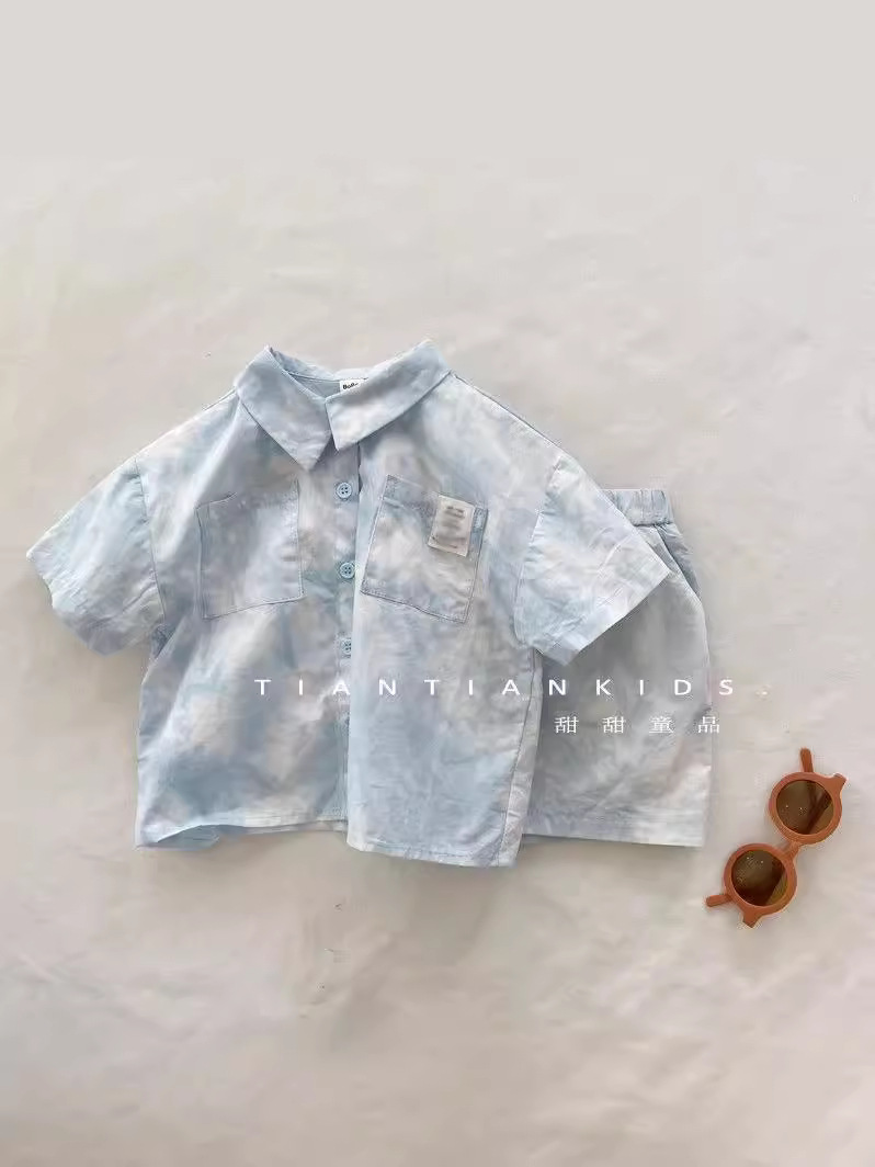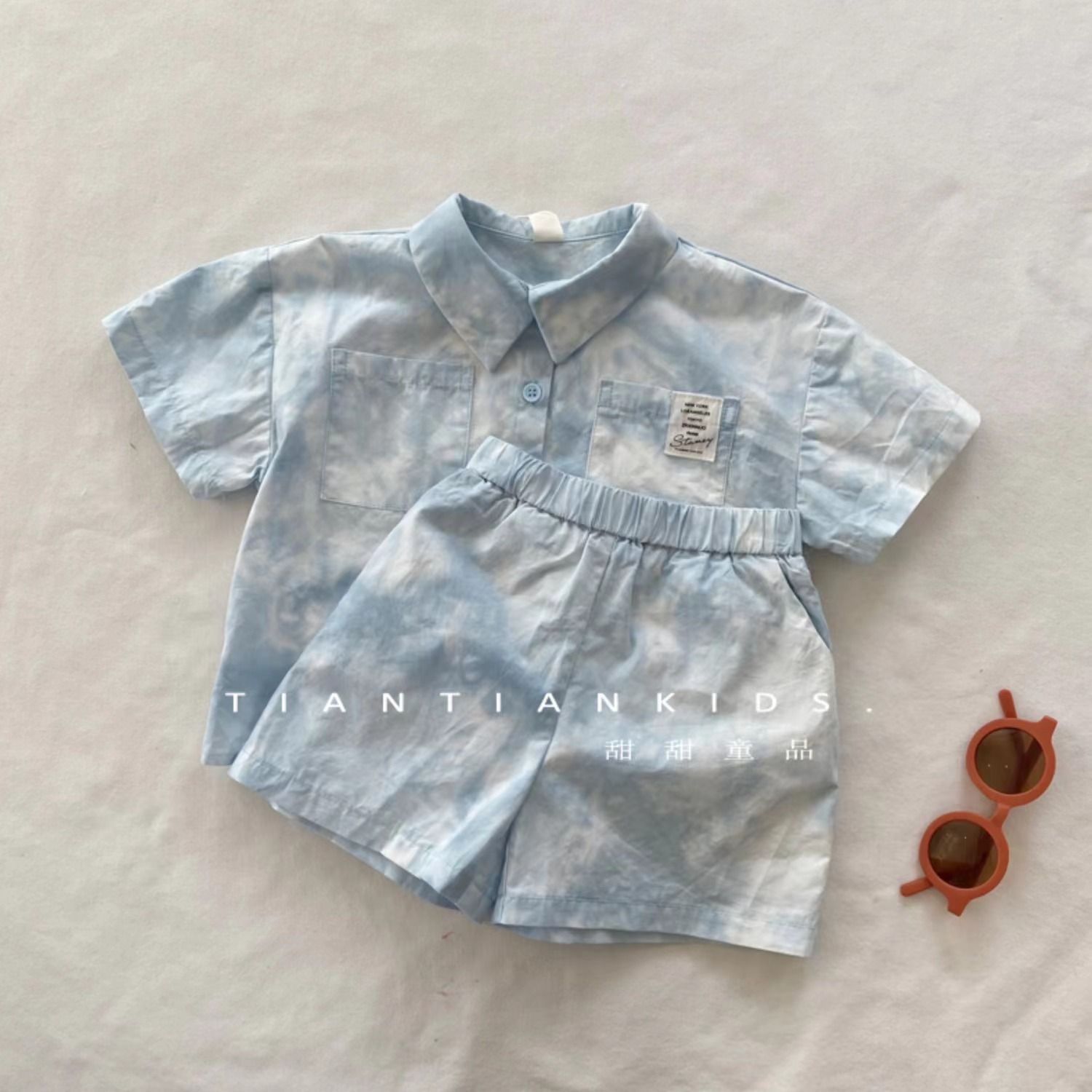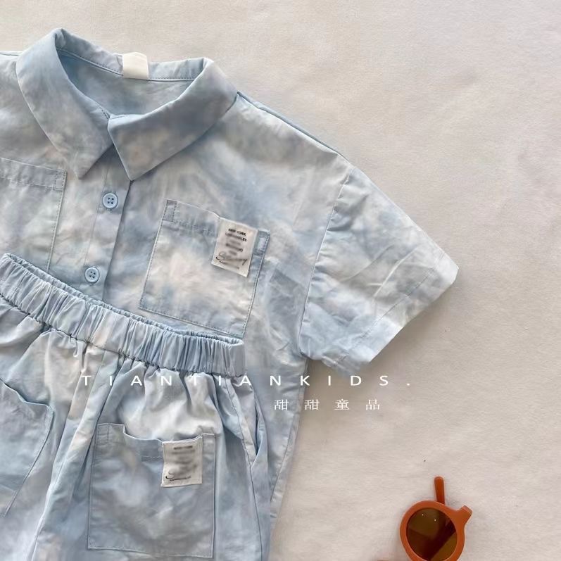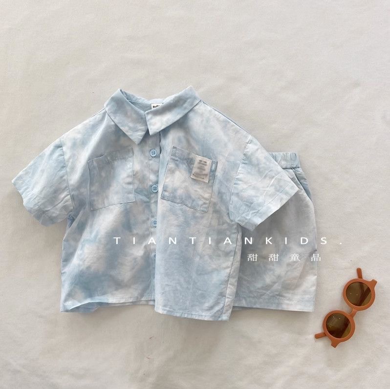 남학생 셔츠 여름 세트 새로운 한국 잘 생긴 유행 어린이 넥타이 염색 반팔 반바지 투피스 트렌디스토어 가기