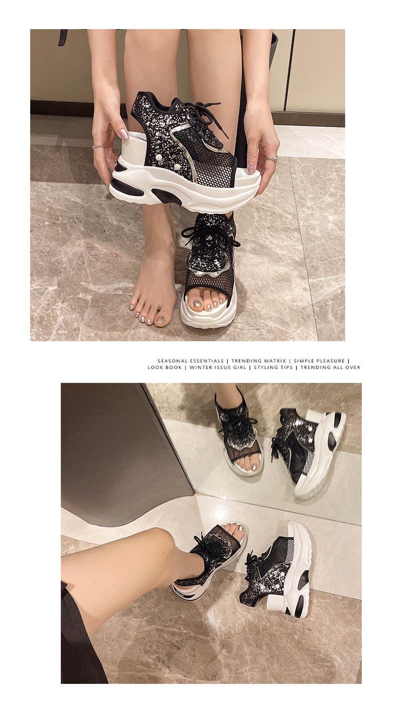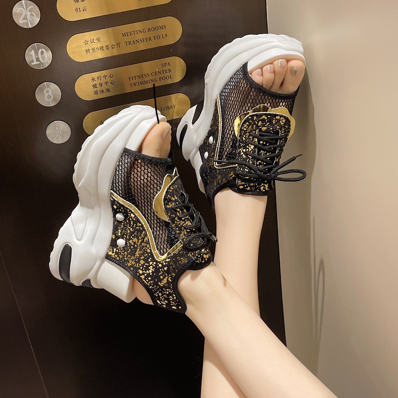 대외 무역 두꺼운 밑창 샌들 도매 2024 년 여름 새로운 레저 해변 중공 플라이 짠 머핀 두꺼운 밑창 스포츠 샌들 여성스토어 가기