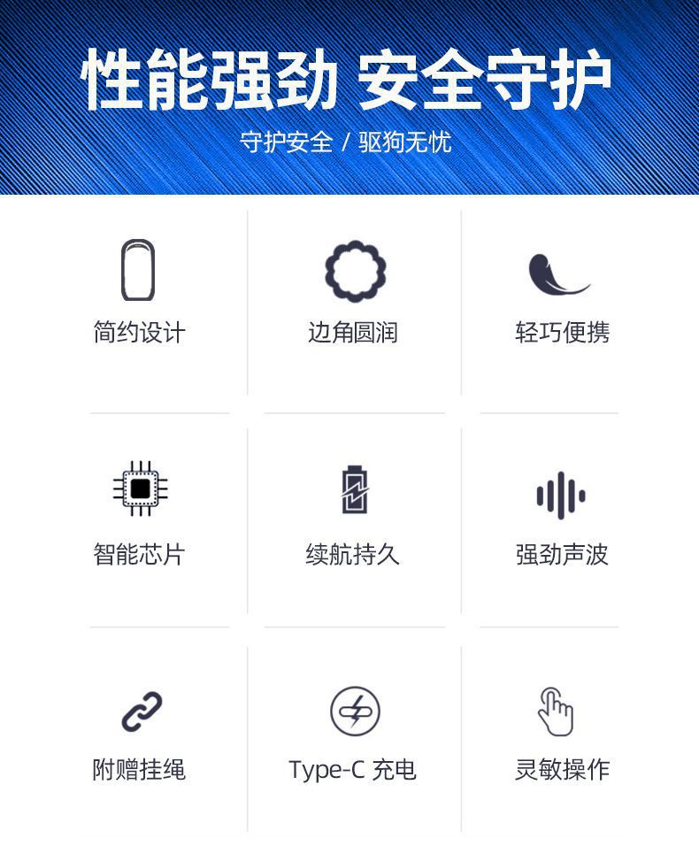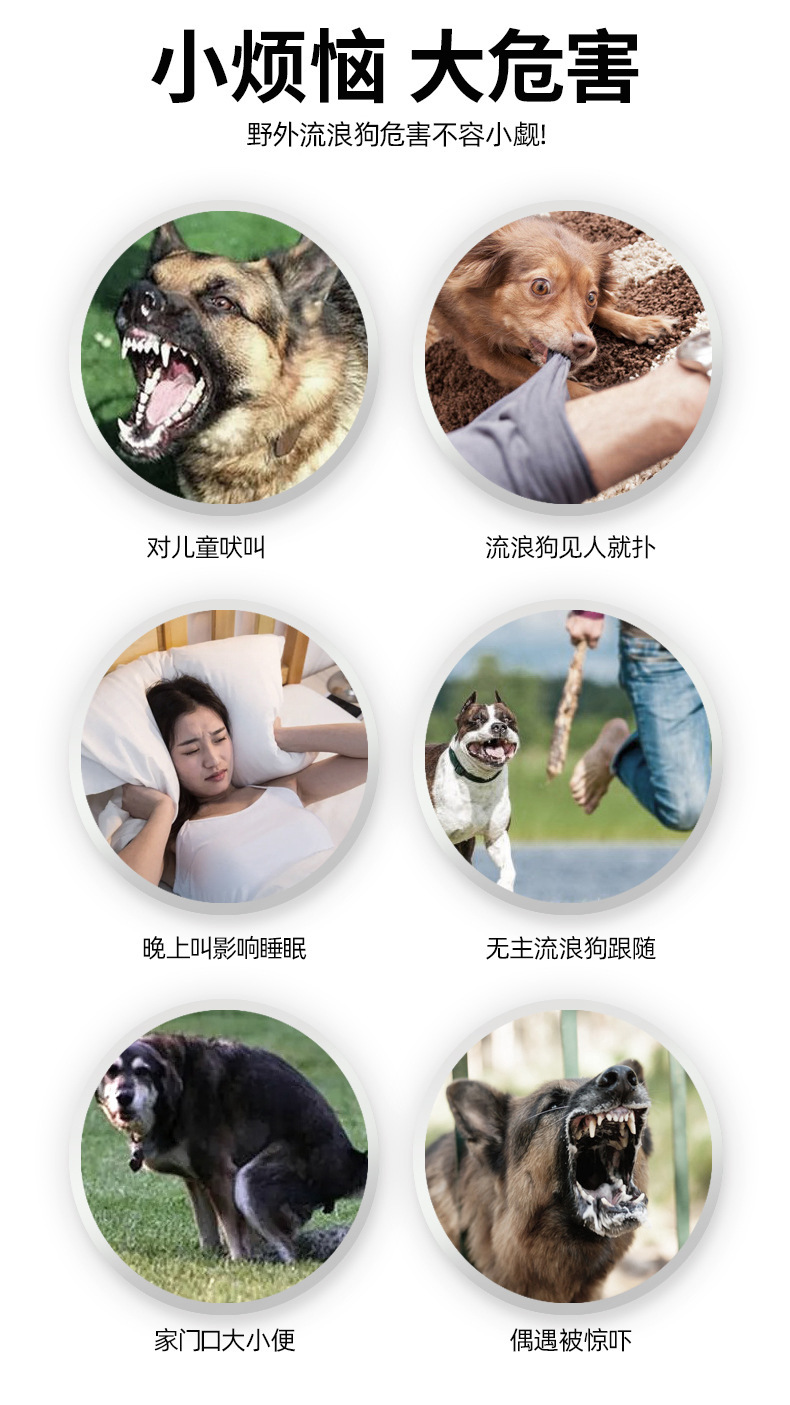 本产品主要用于外出时防止被狗攻击。能对狗、猫产生强烈的刺激(人耳会有听不到)对于动物会产生不舒服及难以忍受的干扰,而且此一刺耳的声音会在动物接近时更加严重让狗感觉不适宜而做出非常惊恐并仓惶逃离。