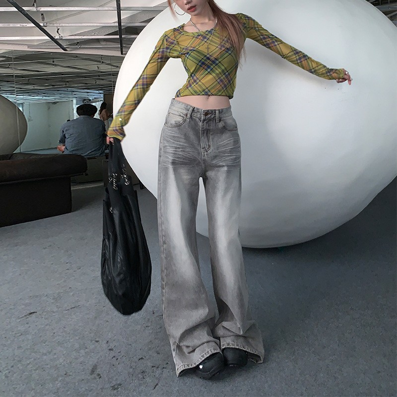 톤 레트로 올드 스트리트 스타일 분위기 게으른 슬랙 블로거 오후 티 리플 그레이 와이드 레그 청바지 여성