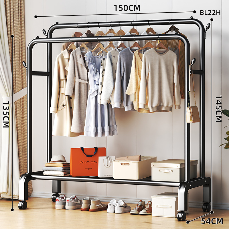 • 이중 극*이중층 150cm 검정색 바퀴가 달린 수납 선반 옷걸이 4개