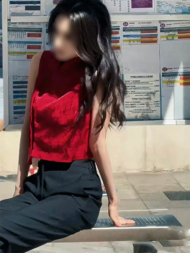 양미 같은 스타일 봄과 여름 2024 새로운 중국 스타일 국가 스타일 붉은 Acetic Acid Jacquard 버클 조끼 칼라 탑 패션스토어 가기