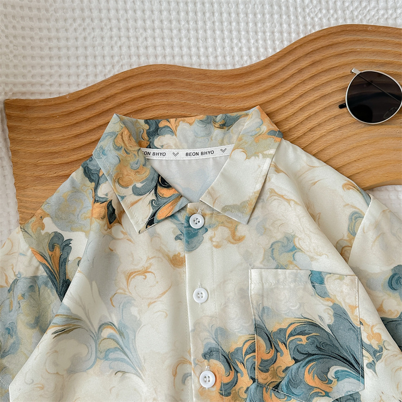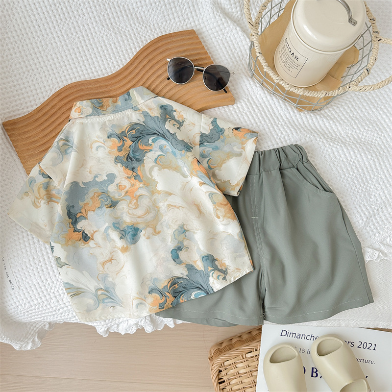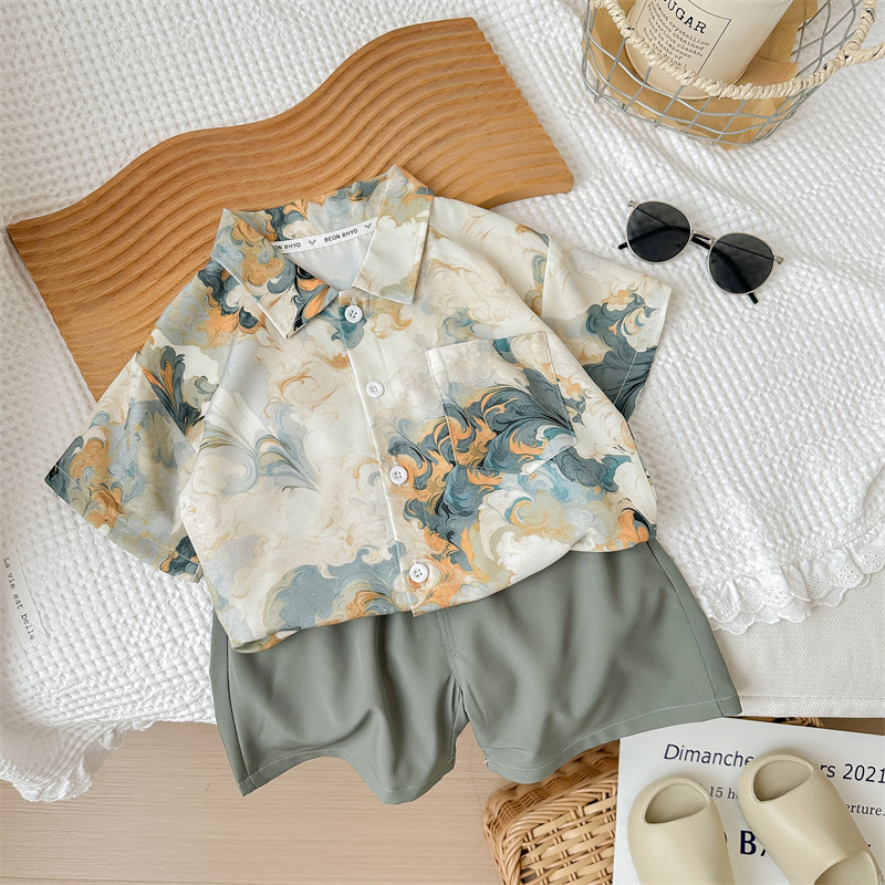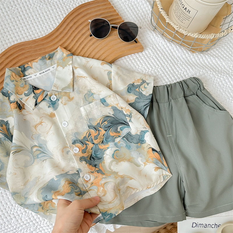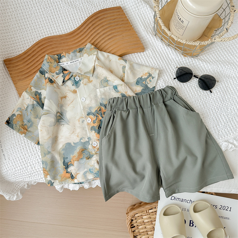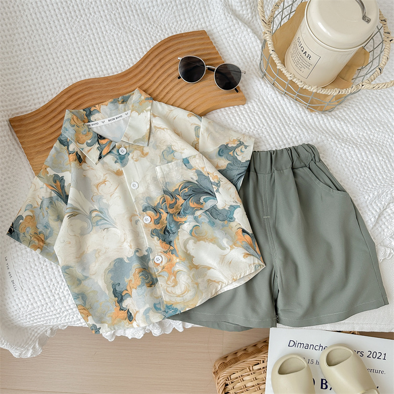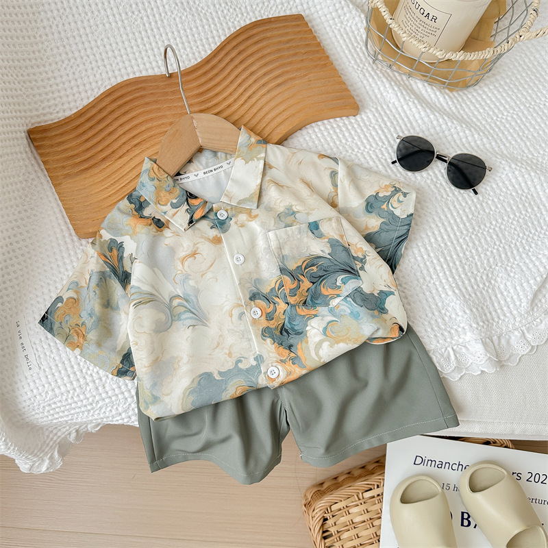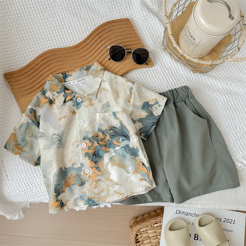 2024 새로운 여름 웨이브 셔츠 반팔 세트 소년 아기 캐주얼 투피스 세트