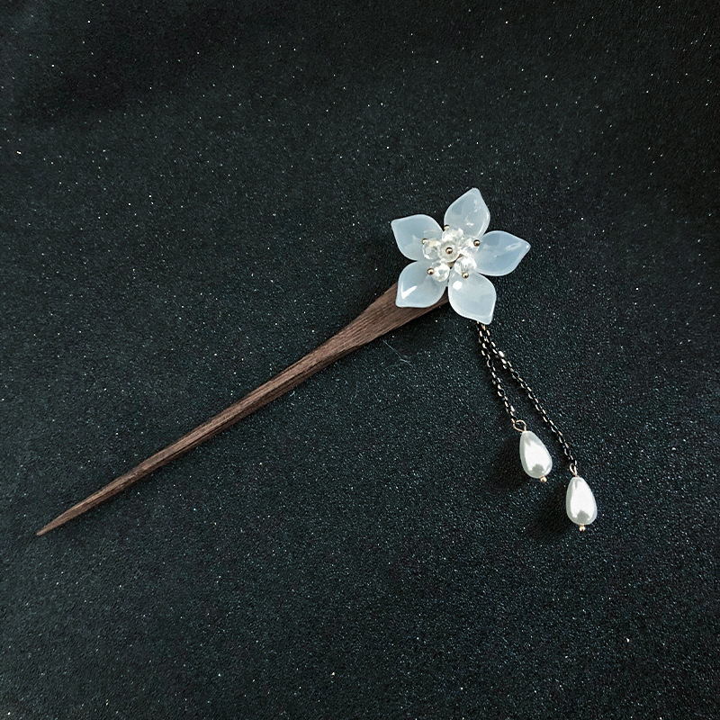 • 복숭아 꽃 블루 프린지 나무 머리핀