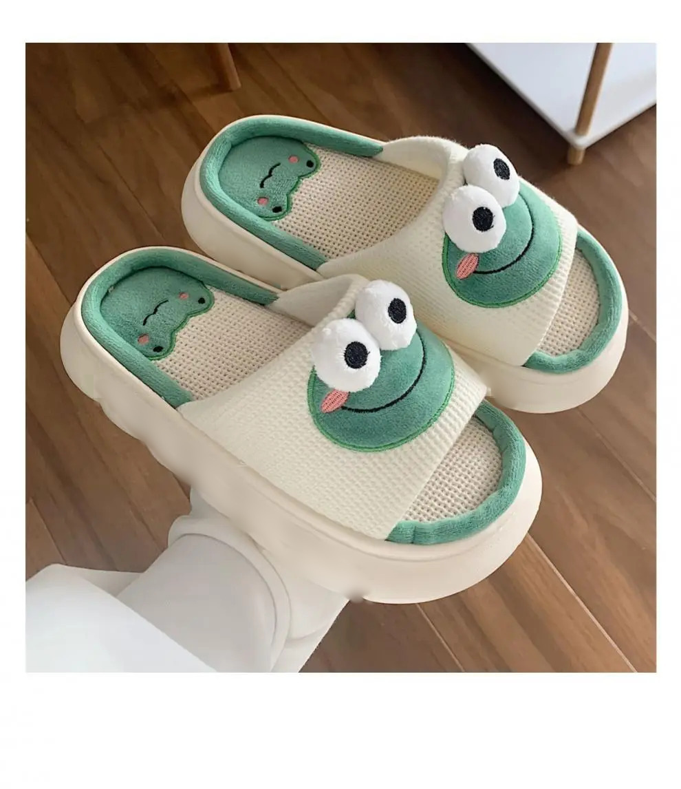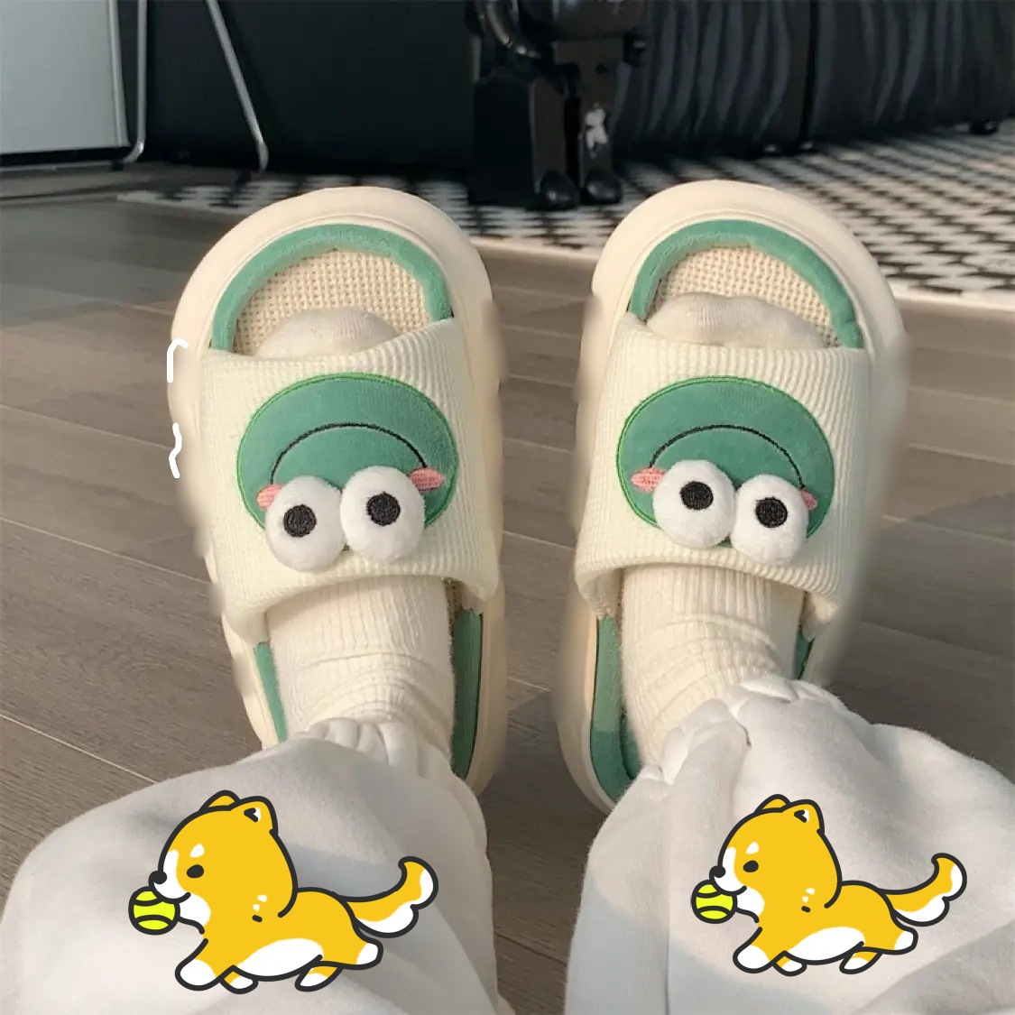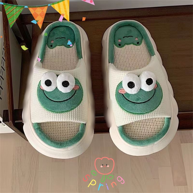 국경 새 집 면 리넨 슬리퍼 사계절 실내 귀여운 만화 개구리 소 리넨 슬리퍼
